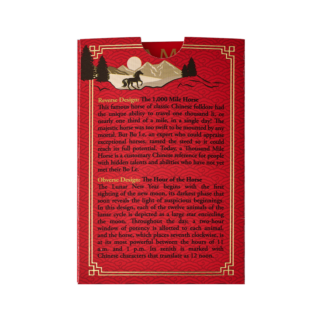 Celebrate the Year of the Horse with the third release in the captivating Lunar Legends series. This 1 oz pure silver bar brings to life the legendary 1,000 Mile Horse, a mythical creature from classic Chinese folklore known for its extraordinary endurance—able to travel one thousand li in a single day. According to legend, only Bo Le, the famed judge of horses, possessed the skill to truly master this magnificent steed.
