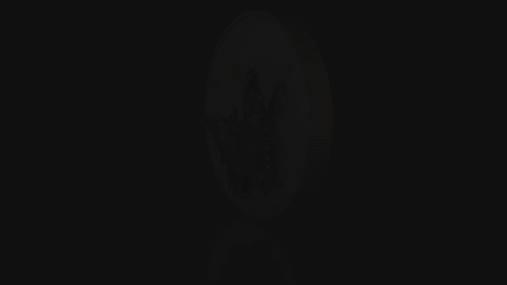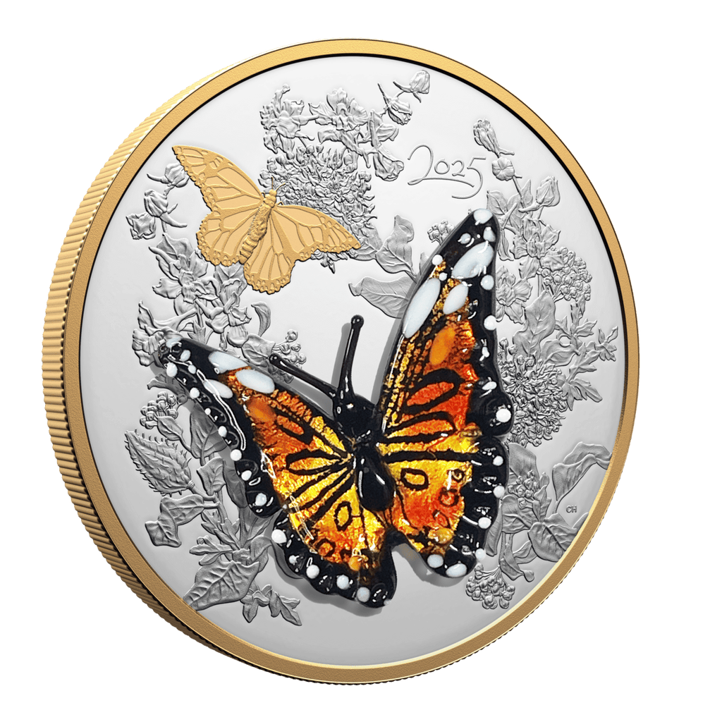 A monarch butterfly’s orange-and-black colouration and stained-glass-like wings never fail to catch the eye as it flits by on the breeze, nature’s own fluttering work of art. The Murano glass monarch butterfly on this half-kilo coin is also impossible to miss due to its large size and the cloche-like capsule that complements the botanical theme and makes for a memorable presentation.