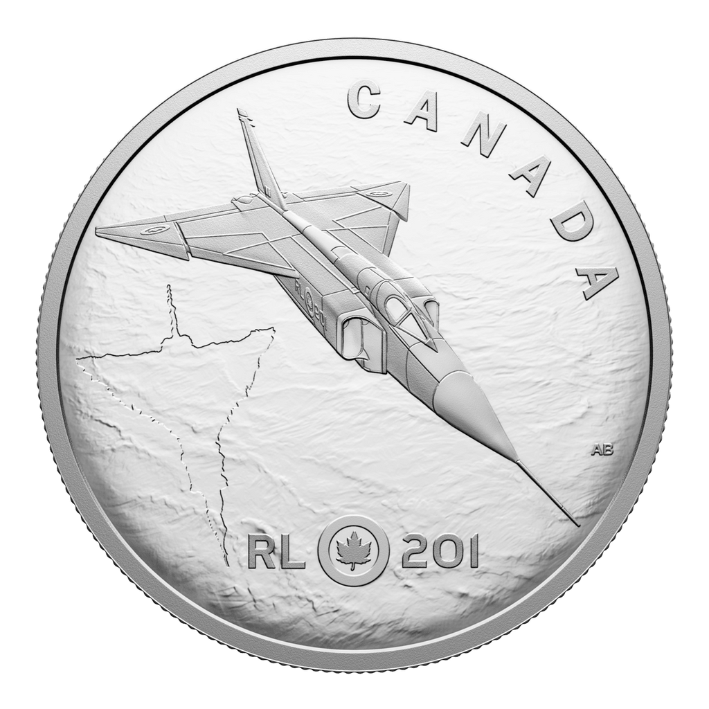 Celebrate an iconic piece of Canadian aviation history! The reverse design shows the first Arrow, RL-201, flying over Lake Ontario, while the outline engraved incuse on the water invokes the scale models that were launched over those very waters as part of the development process.