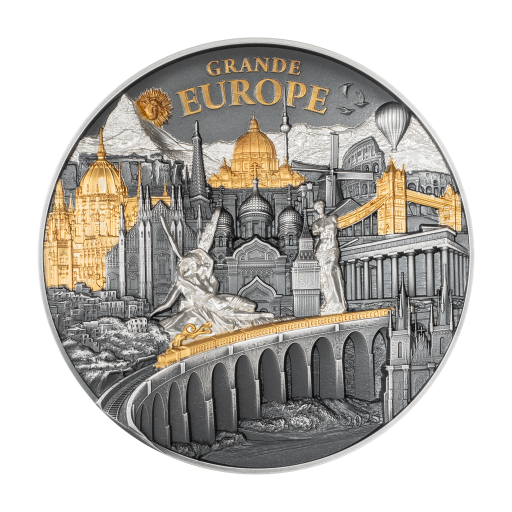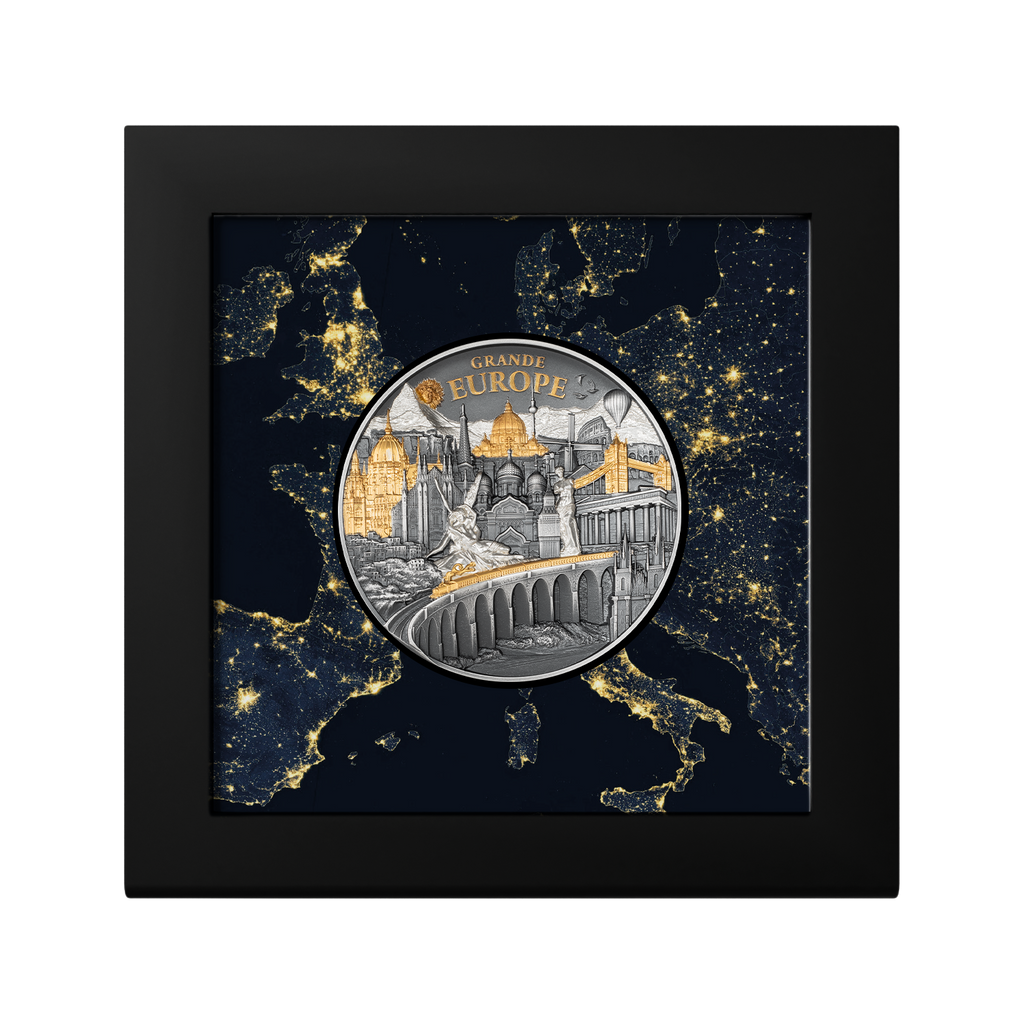 Embark on an artistic journey across Europe with the Hidden Treasure – Grande Europe coin, a stunning 3 oz silver collectible that blends history, art, and playful discovery. This masterpiece showcases over 20 iconic European landmarks, intricately rendered in an antique finish with proof-quality elements and selective gold plating, creating a striking 3D effect that reveals new details with every glance.