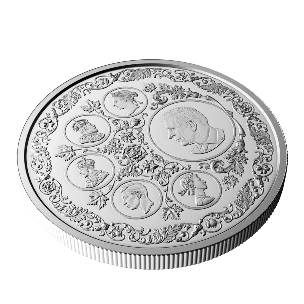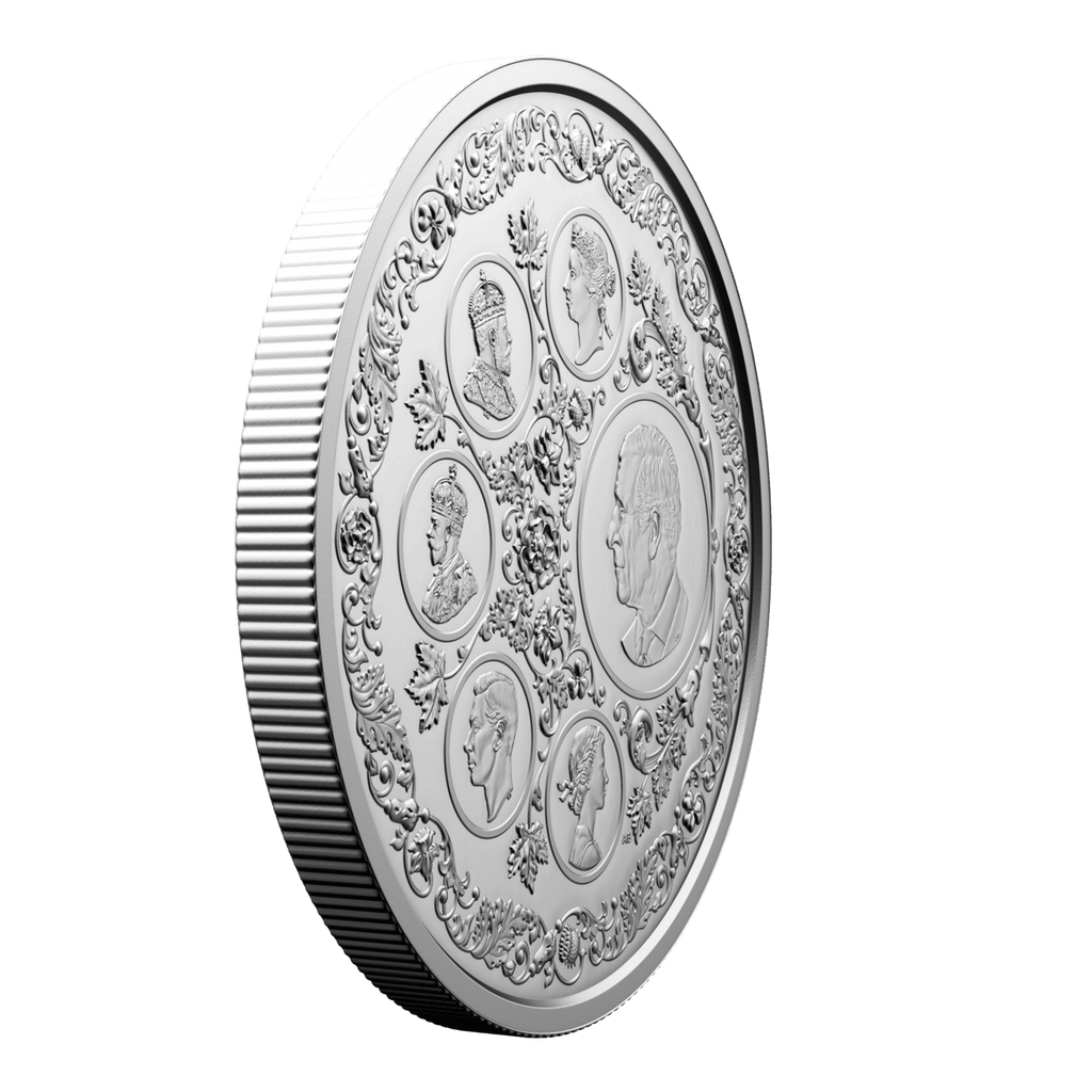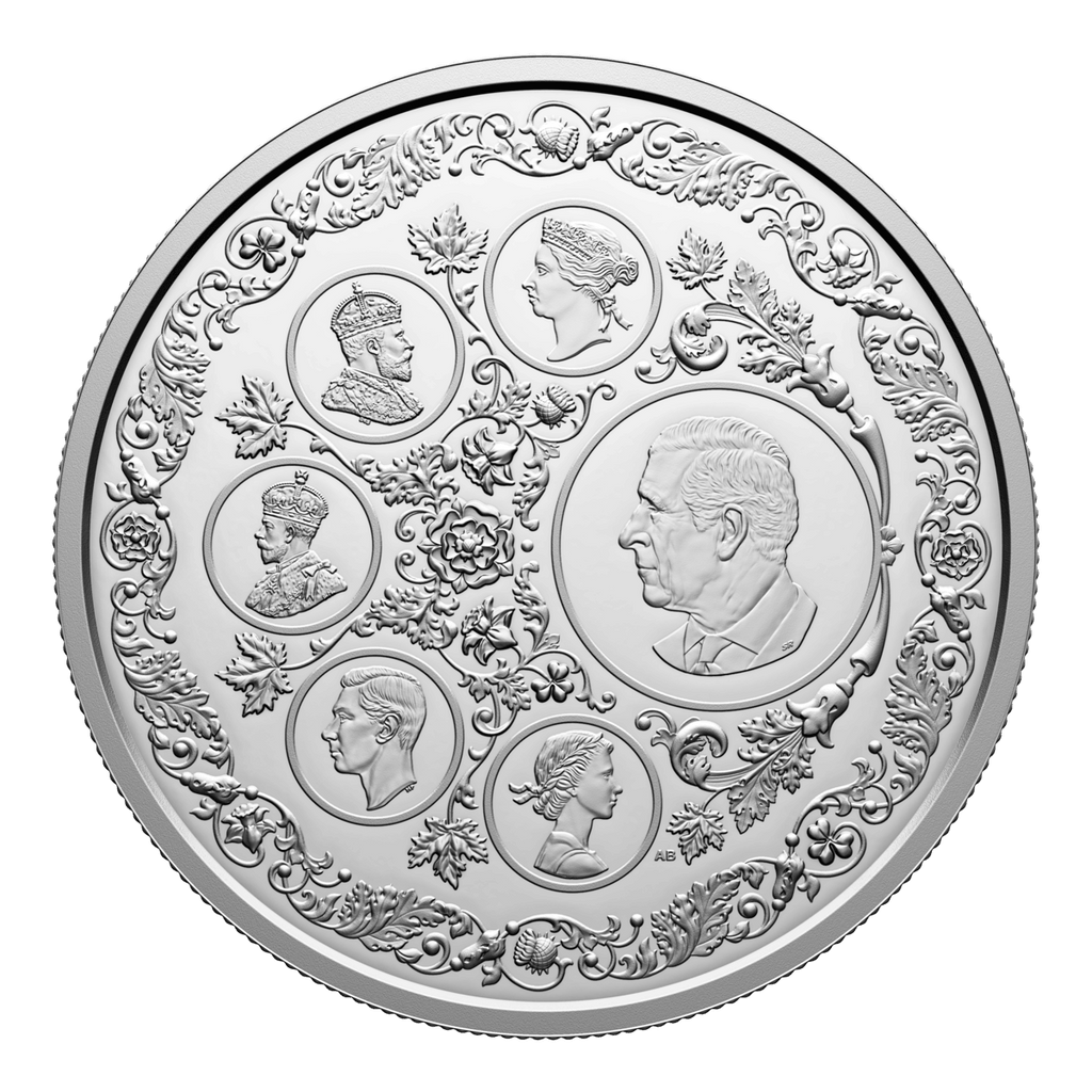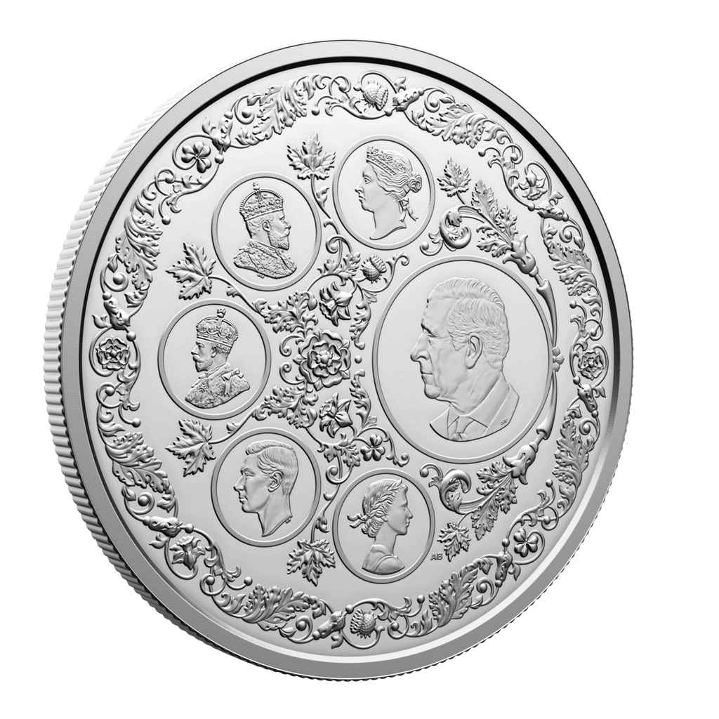 A gorgeous collector’s item, this 5 oz. 99.99% pure silver coin features six different coin effigies on its reverse, one for each of the reigning monarchs whose likenesses have appeared on post-Confederation Canadian coinage. These select effigies from Canada’s coins trace the royal line of succession and the Crown through their different era—from the Queen Victoria diadem portrait seen on the first coins issued by the Dominion of Canada 155 years ago, to the present effigy of His Majesty King Charles III.