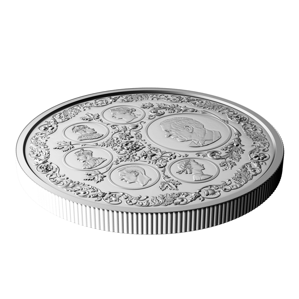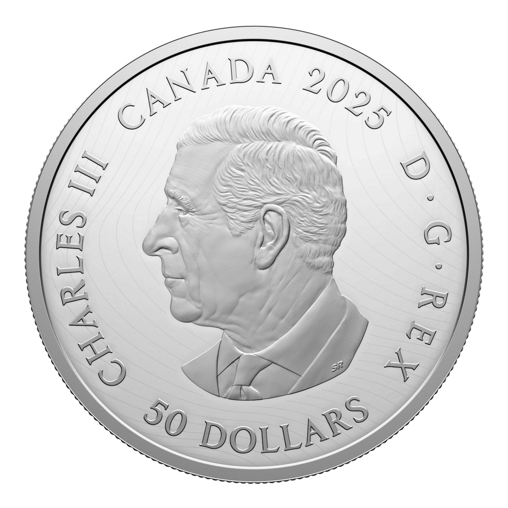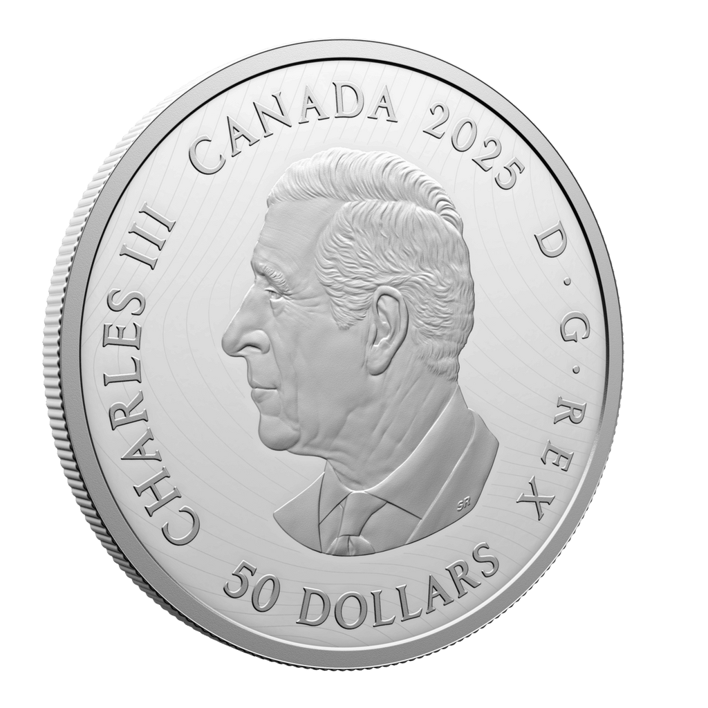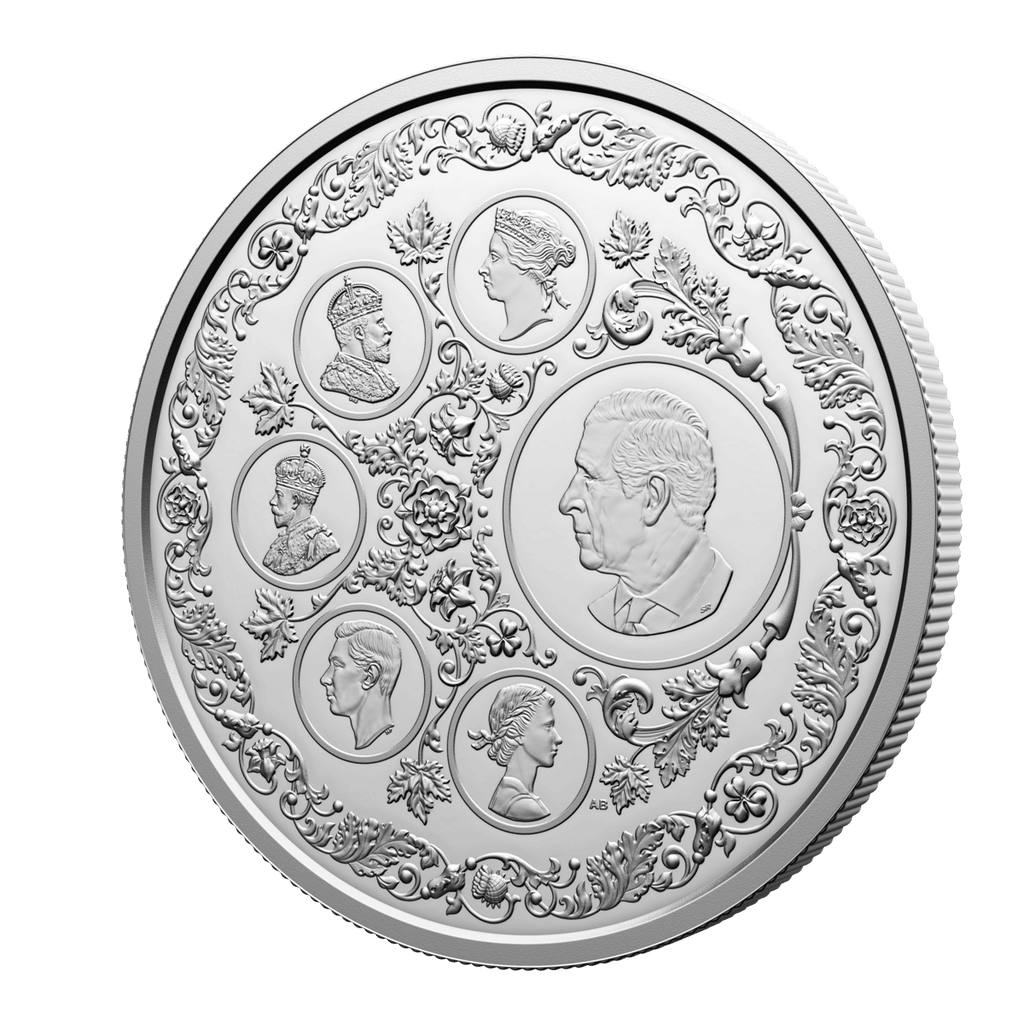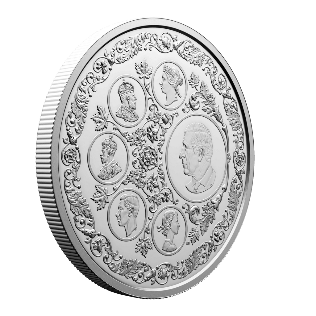 A gorgeous collector’s item, this 5 oz. 99.99% pure silver coin features six different coin effigies on its reverse, one for each of the reigning monarchs whose likenesses have appeared on post-Confederation Canadian coinage. These select effigies from Canada’s coins trace the royal line of succession and the Crown through their different era—from the Queen Victoria diadem portrait seen on the first coins issued by the Dominion of Canada 155 years ago, to the present effigy of His Majesty King Charles III.