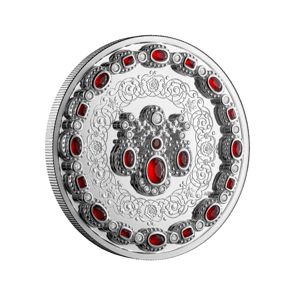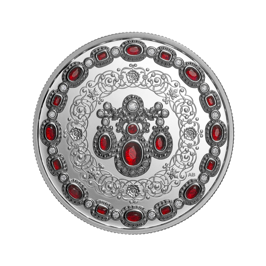 Celebrate the timeless legacy of Queen Elizabeth II on the centenary of her birth with this jewellery-themed 1 oz. 99.99% pure silver coin, the third in the Royal Canadian Mint’s Crown Jewels series. Adorned with 20 red crystals and 27 white crystals, all set in sterling silver jewellery mountings, the coin’s reverse reimagines the Baring Ruby Necklace as distinct elements—the neckline and the pendant centrepiece—arranged to complement the coin’s circular shape while honouring the harmony (and sparkle) of the original design.