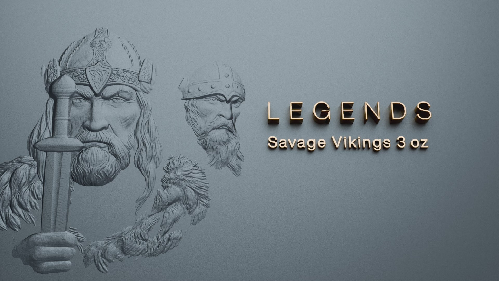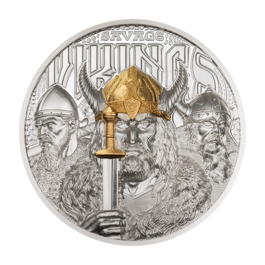 The sixth and final instalment of the Savage series unleashes the fierce spirit of Viking legend. This 3 oz .9999 fine silver coin features Ragnar Lodbrok and his sons, Ivar the Boneless and Björn Ironside, brought to life in exceptional ultra-high relief.