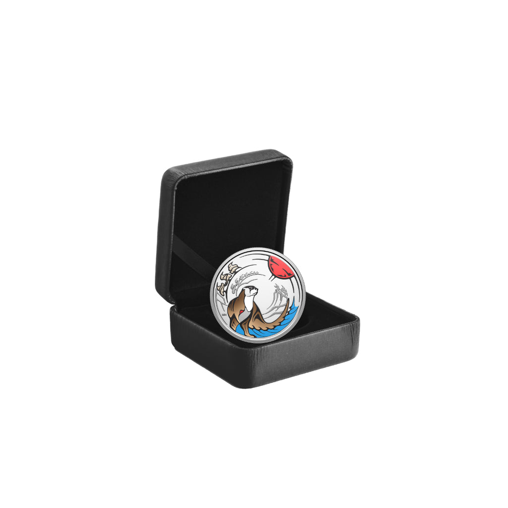 A sleek, contemporary palette pairs bold, elemental forms—like the sun, rendered here in striking red, and the blue water—with the understated elegance of soft earth tones. This 3⁄4 oz. 99.99% pure silver coin honours Nigig’s special gifts: the ability to weave play into life’s serious work; and as a bringer of kinship, to keep hearts open and communities whole.