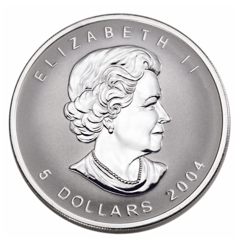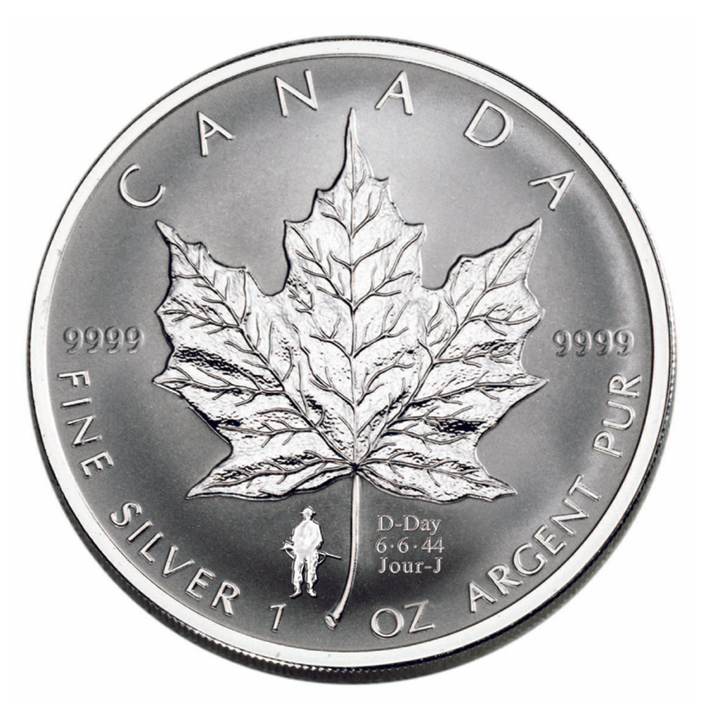 This fine silver one-ounce maple leaf coin commemorates the sacrifices made by Allied veterans on the 60th anniversary of D-Day (June 6, 1944) during the Second World War. This is the first double-privy-mark coin ever minted by the Royal Canadian Mint. To the left of the maple leaf stem, a privy mark of an Allied infantryman with a rifle, wading ashore at Normandy, is depicted. To the right appears the commemoration "D-Day 6-6-44 Jour-J." HST/GST Exempt.