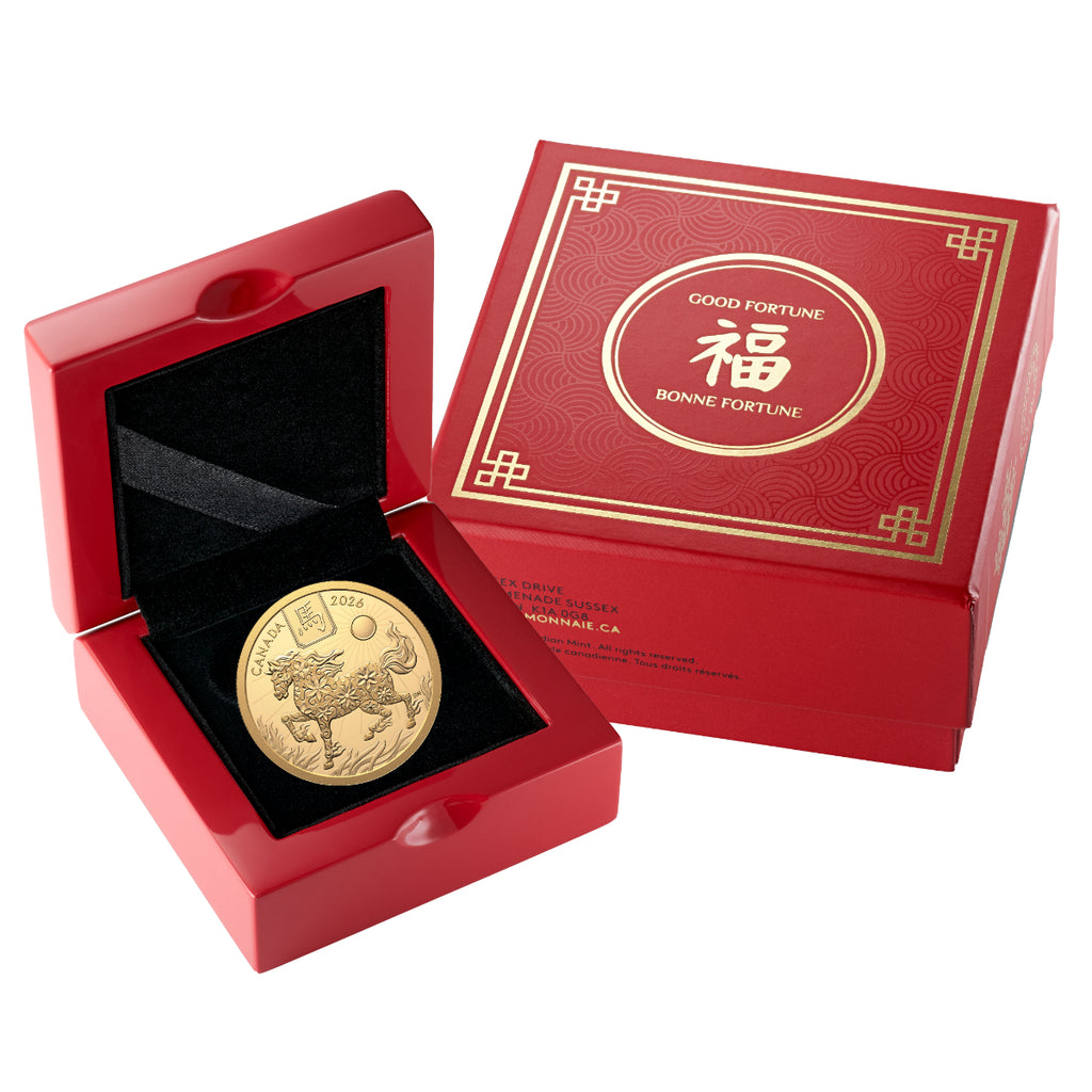 Adorned with lucky jasmine flowers, the Fire Horse’s dashing confidence is evident on this 15.43 g. pure gold coin, where, undaunted by the blazing sun or what lies ahead, the hard-working equine steps assuredly towards success without breaking its stride.