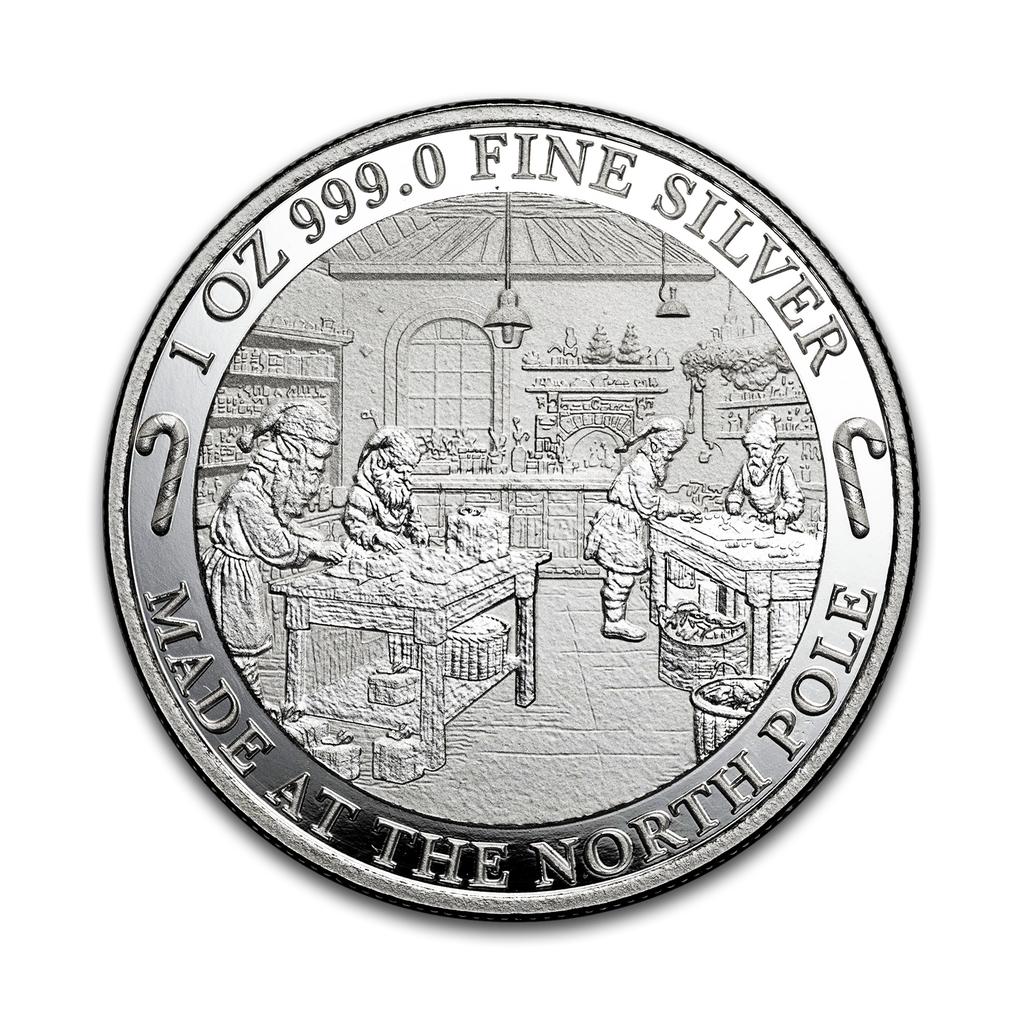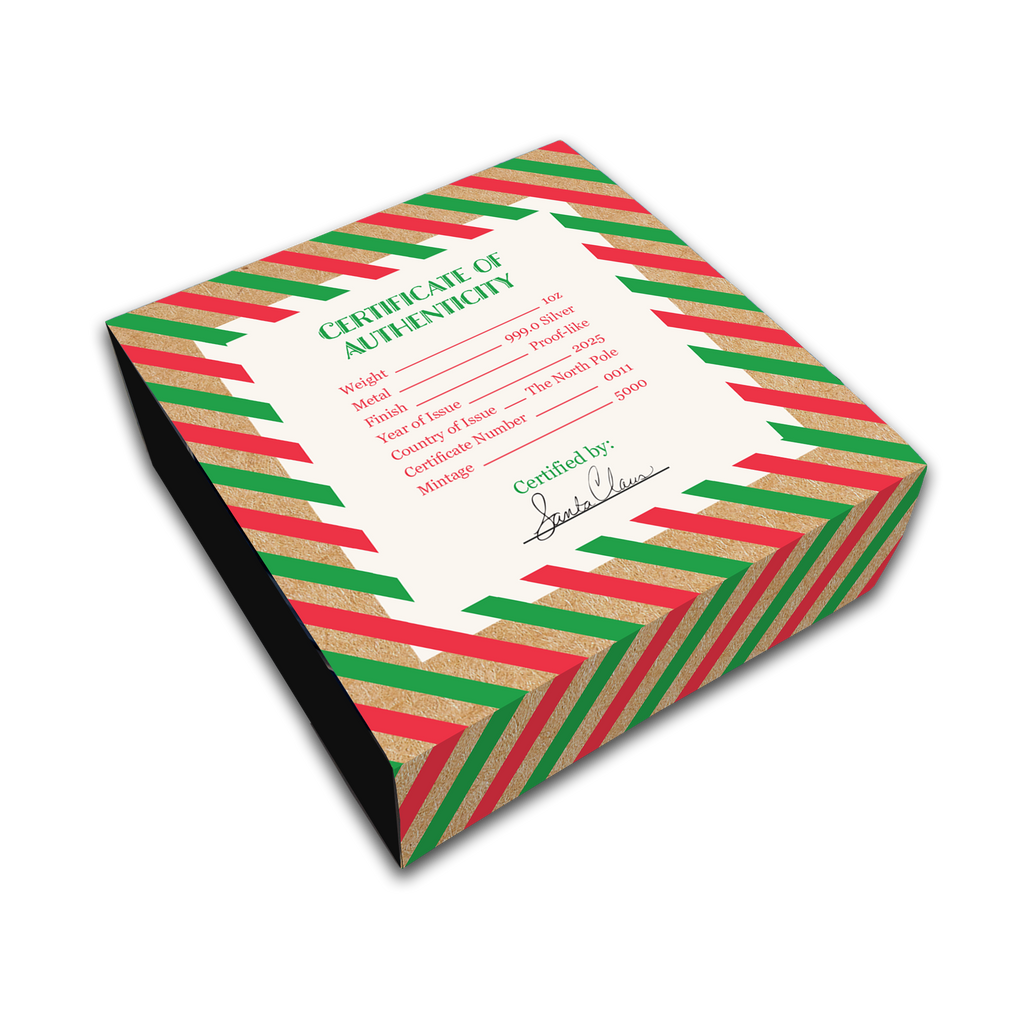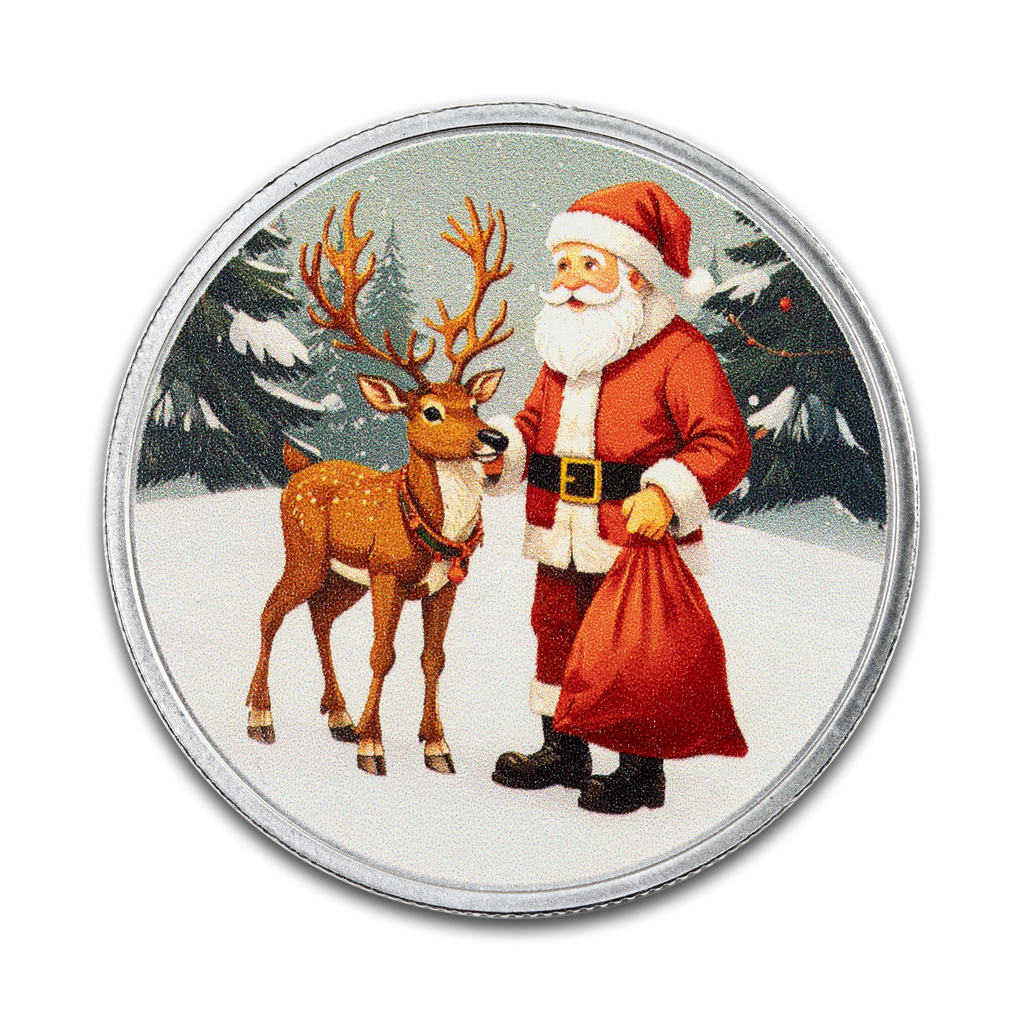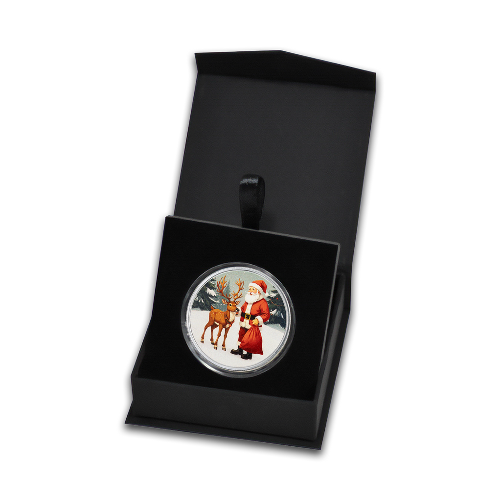 Bursting with festive charm, this beautifully crafted pure silver round showcases Santa and his reindeer in vivid, full-colour detail—capturing the joyful spirit and imagination of the holiday season.