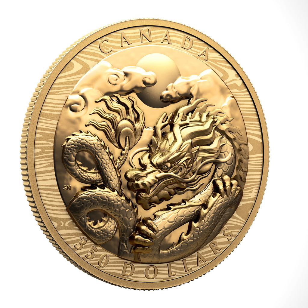 The reverse design by artist Simon Ng celebrates 2024 as the Year of the Wood Dragon through its depiction of the Dragon, the fifth sign in the 12-year cycle of the Chinese Zodiac. Framed by a laser-engraved pattern that represents the Wood element, the Dragon moves among the clouds in a night sky illuminated by the moon, its tail coiled to form the shape of lucky number 8. A rear view of that scene is presented on the obverse, which, like the reverse, features Extraordinarily High Relief (EHR) that gives the Dragon a more three-dimensional form. The obverse also features the effigy of Queen Elizabeth II by Susanna Blunt at the top. The obverse also bears a special marking that includes four pearls symbolizing the four effigies that have graced Canadian coins and the double date of her reign.