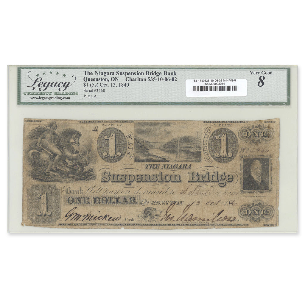 Front Design: St. George slaying the dragon/Niagara suspension bridge; dog's head below/King William IV
