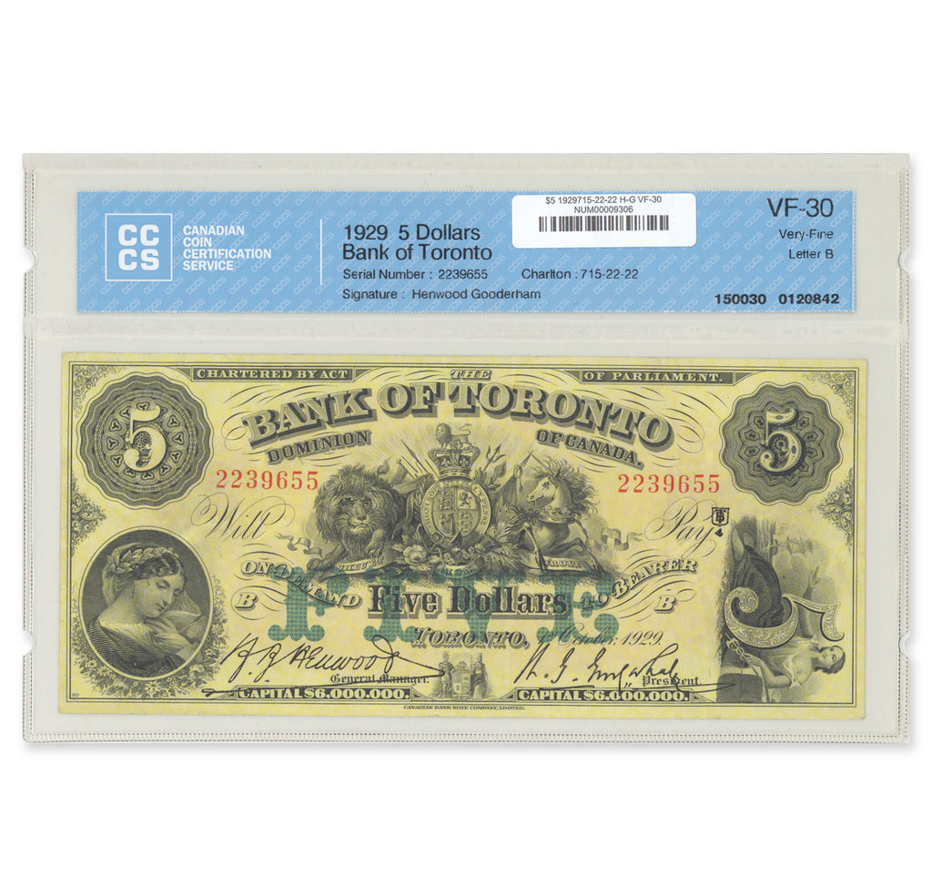 $5 1929 715-22-22 The Bank of Toronto Henwood-Gooderham CCCS VF-30