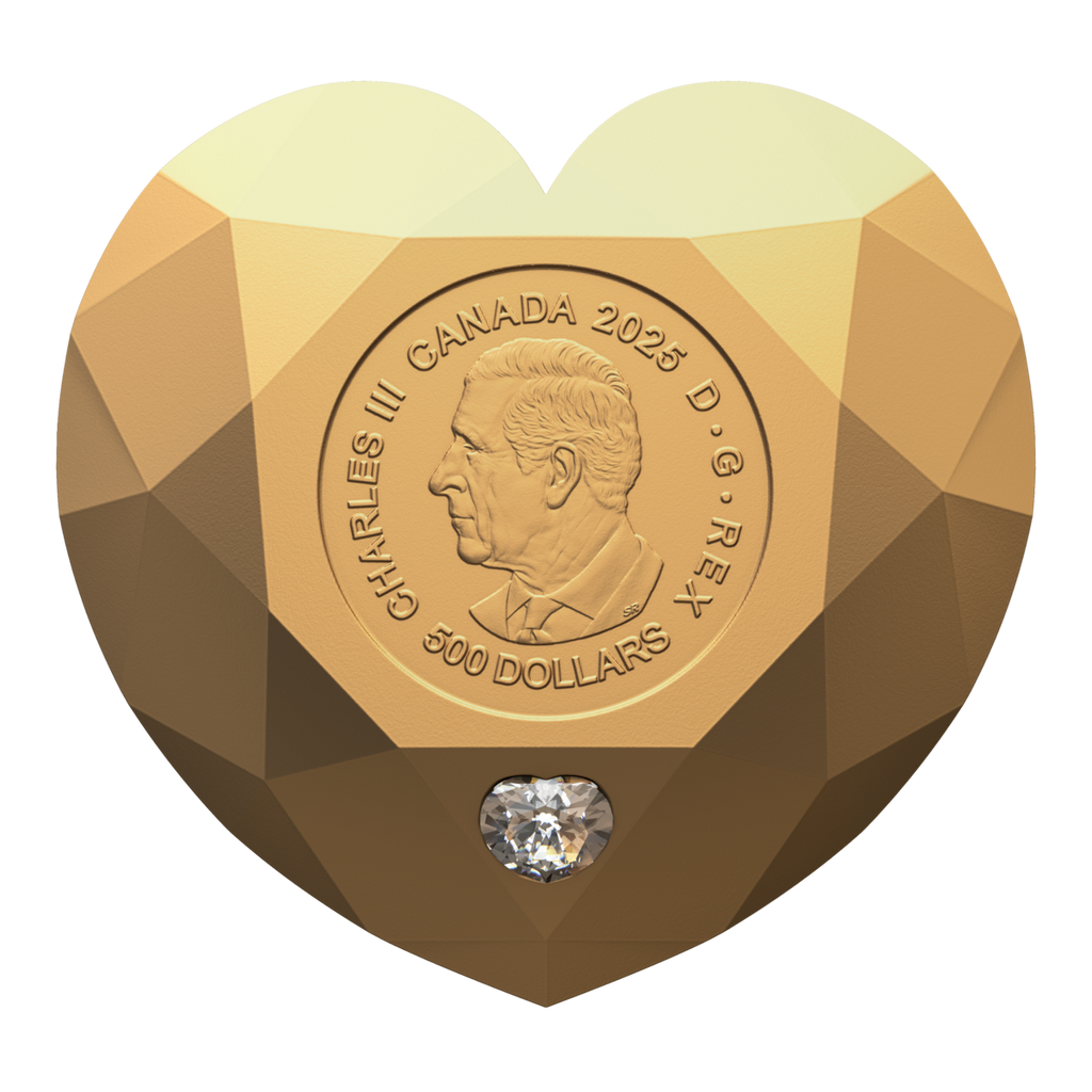 Crafted in 99.99% pure gold, and embedded in one of the coin’s engraved facets, the 0.23-carat Ideal Cut Heart Diamond and its patented cut inspired this coin’s multi-dimensional shape. With a mintage of 150 worldwide, it celebrates the incomparable beauty of a Canadian diamond by replicating a classic diamond shape and cut.