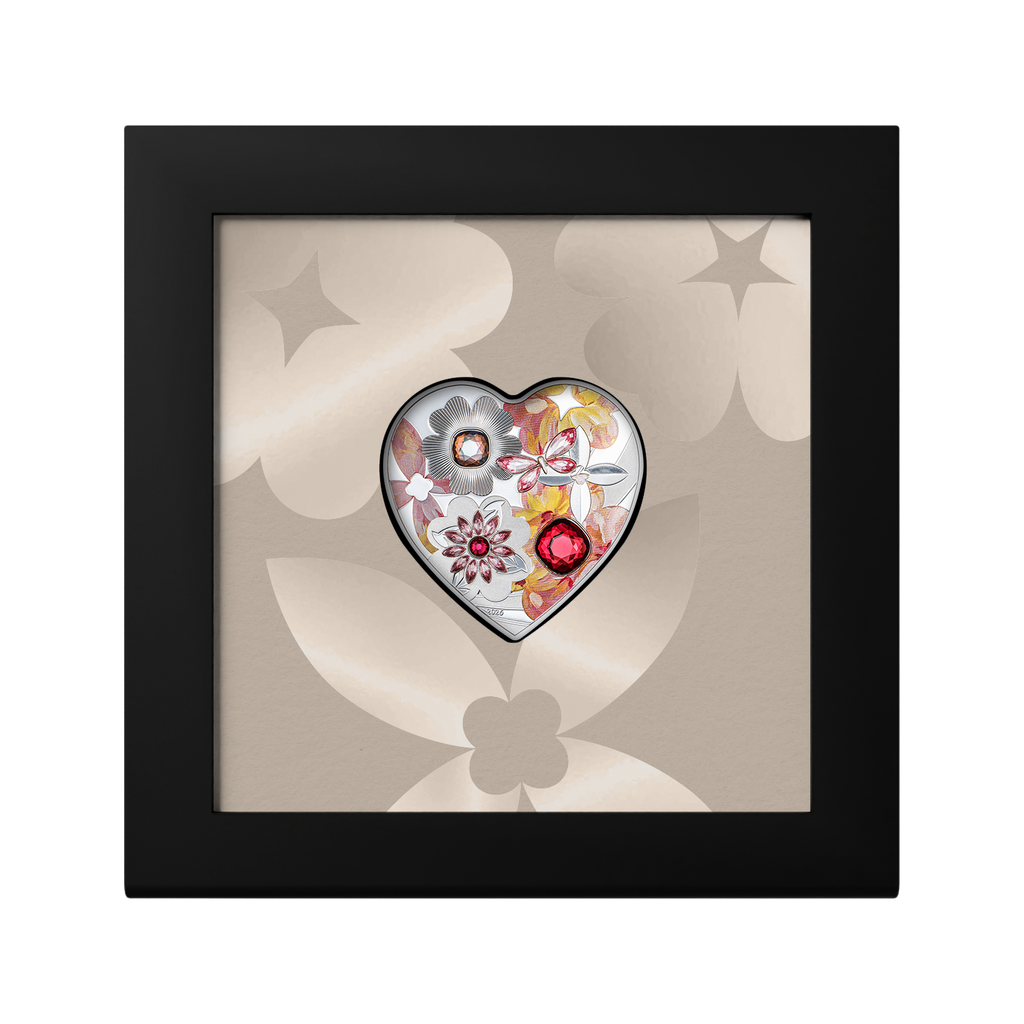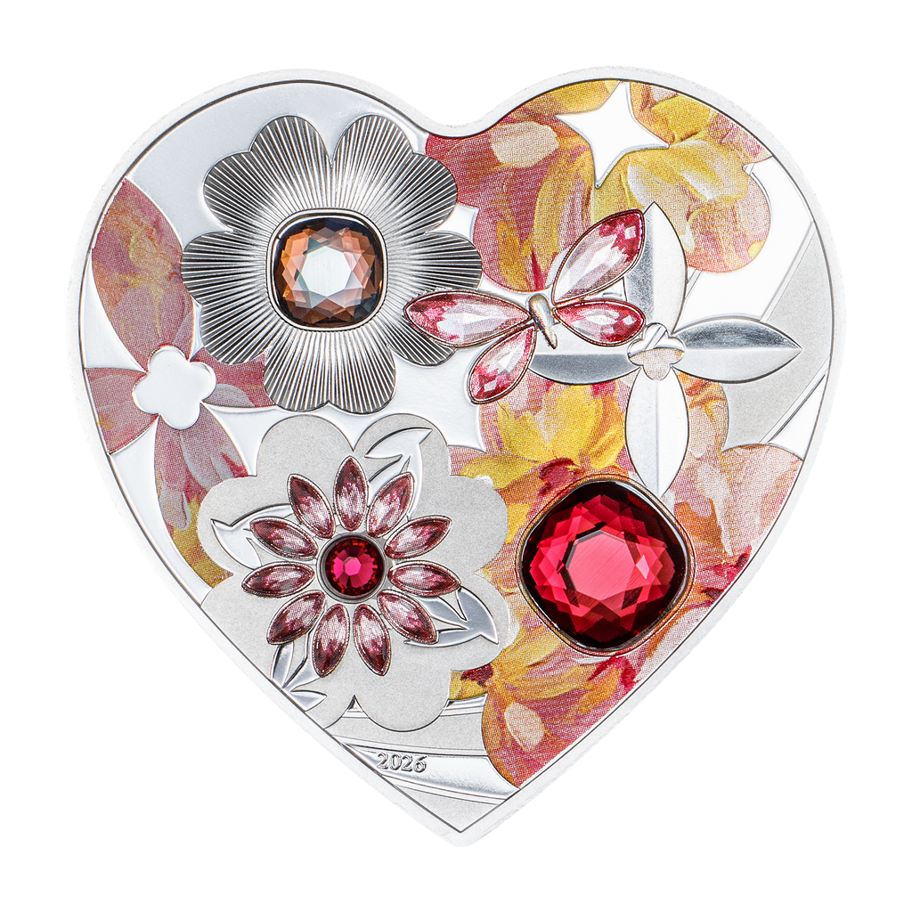 This extraordinary heart-shaped collectible is struck in refined classic minting and beautifully merges timeless artistry with modern design. Delicate floral graphics flow across the surface, enhanced with soft, vibrant coloring that brings the motif to life and captures the gentle spirit of nature.