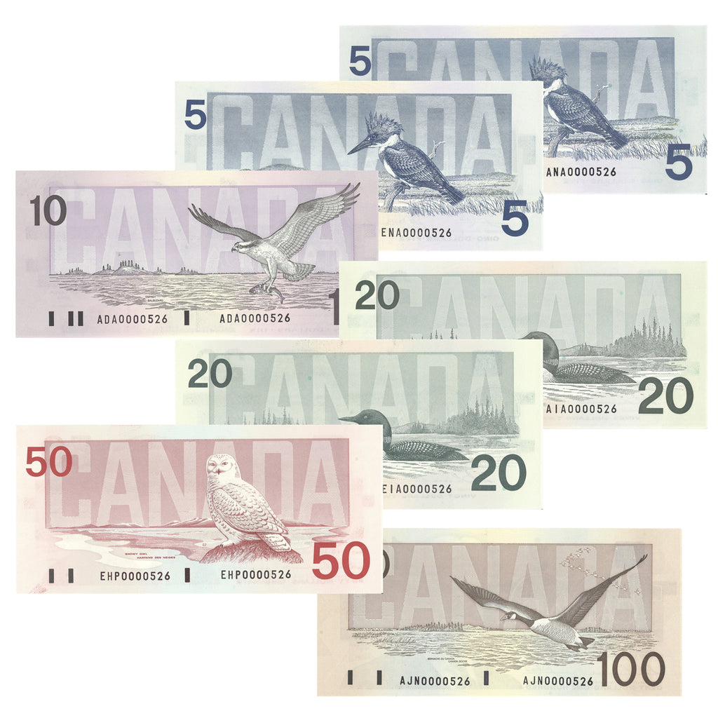 CH UNC $5 - $100 Bird Series 7 Banknote Set - Matching Serial Numbers