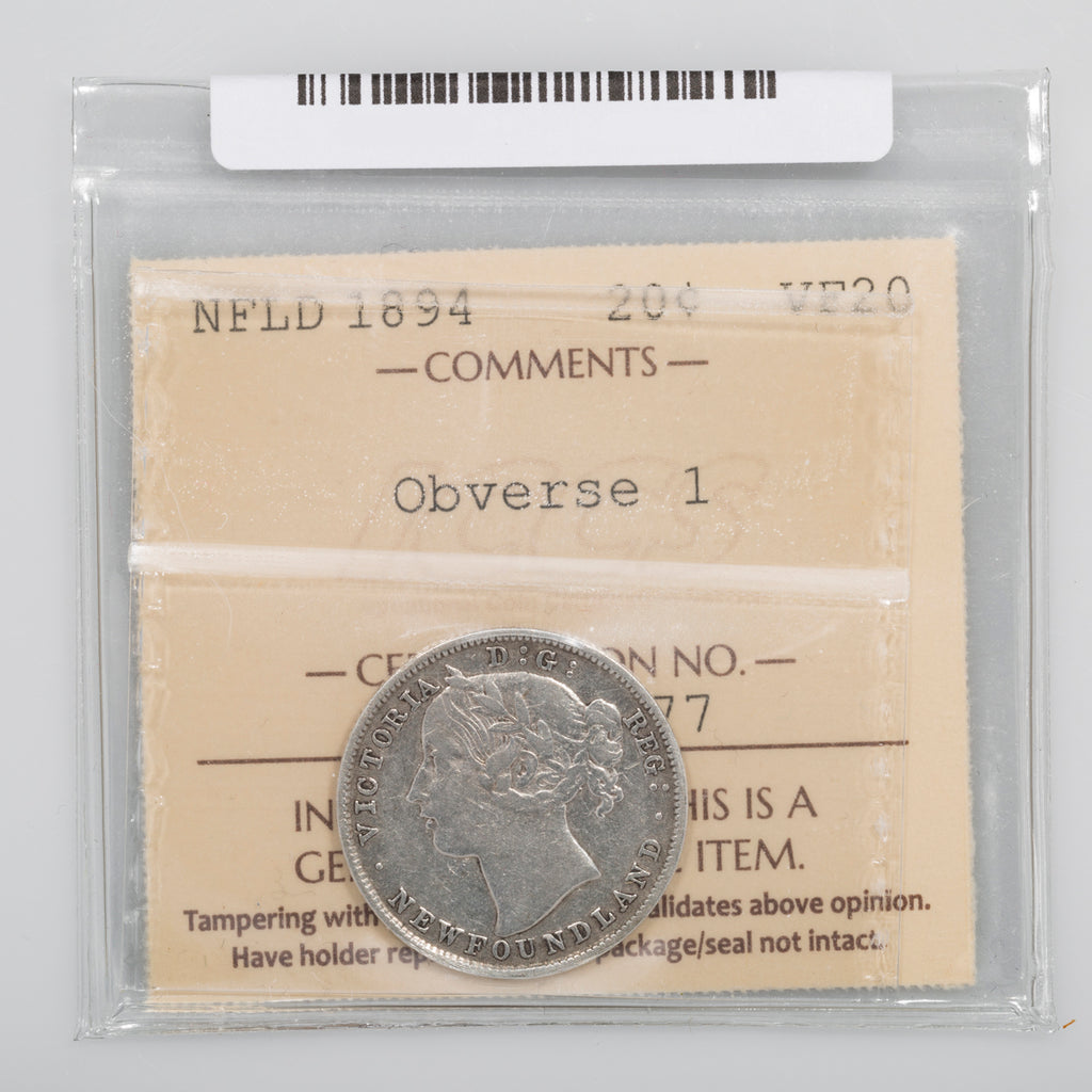 NFLD 20 Cent 1894 Obverse 1 ICCS VF-20