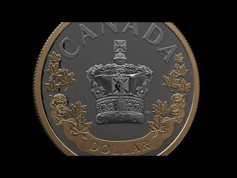 The elegant design features the Imperial State Crown carried on a cushion and framed by maple leaves and roses to represent the reign of Queen Elizabeth II. A Queen Elizabeth rose and a maple leaf appear at the edges of a banner that bears the face value, “1 DOLLAR”, while “CANADA” is inscribed at the top. Selective 24 karat gold plating accentuates the design.