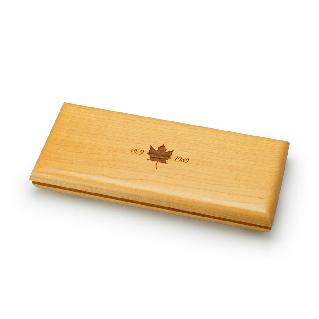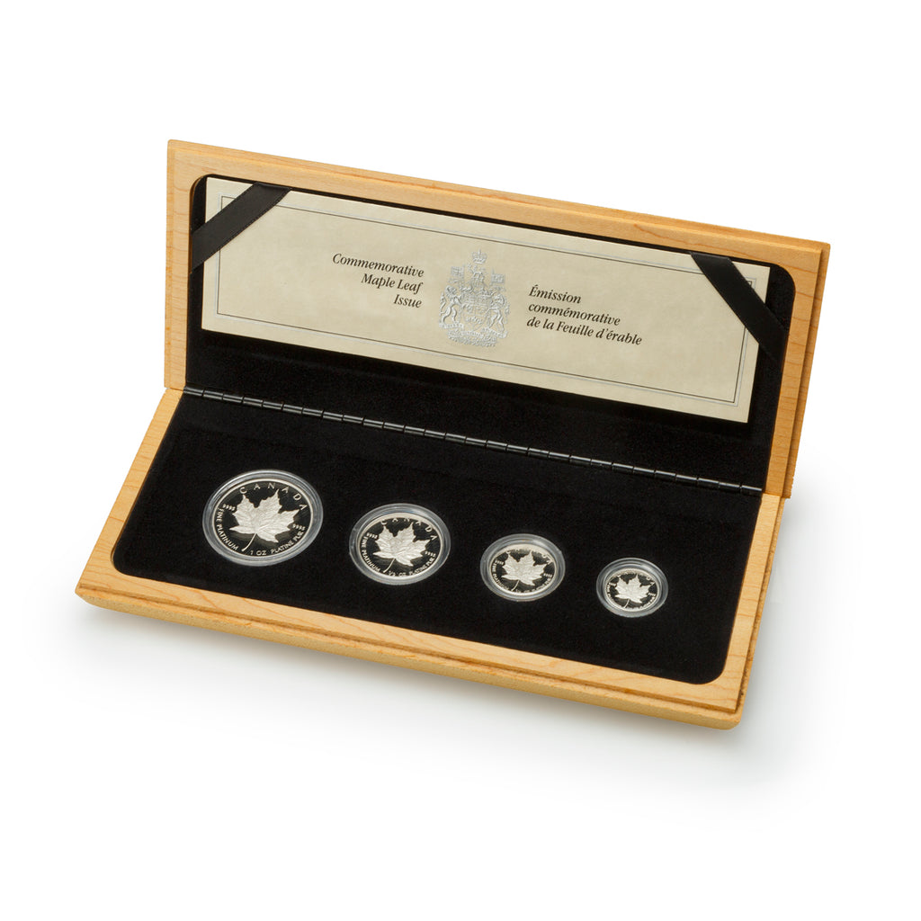 In February 1979, The Government of Canada authorized the Royal Canadian Mint to establish a special coin programme and, on September 5th, 1979, the Gold Maple Leaf was introduced. This set of four commemorative proof coins celebrates the 10th anniversary of the Maple Leaf's entry into the market.