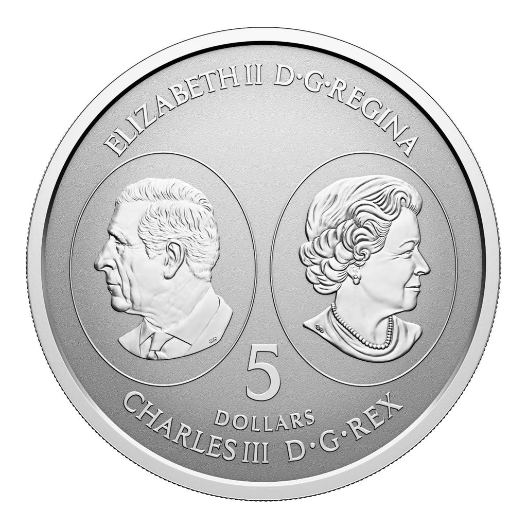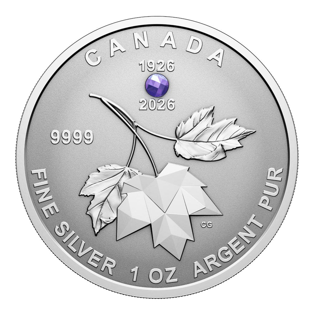 Each coin’s reverse features the classic-meets-modern representation of Canadian maple leaves, while the double-effigy obverse serves to both honour the past and acknowledge the continuity of the Crown. The 1 oz. coin’s purple crystal adds a regal hue to this tribute to the long-reigning sovereign, whose steady presence helped shape Canada’s identity in the modern era.
