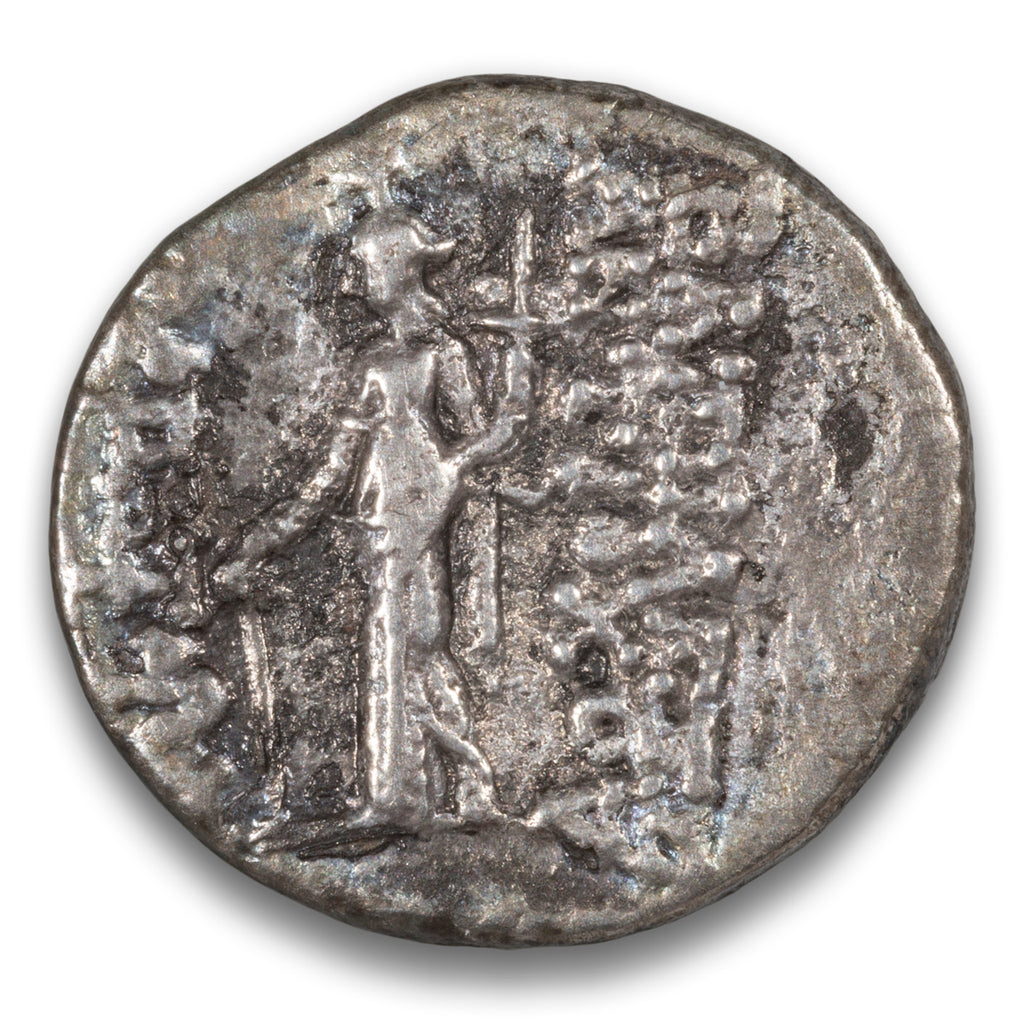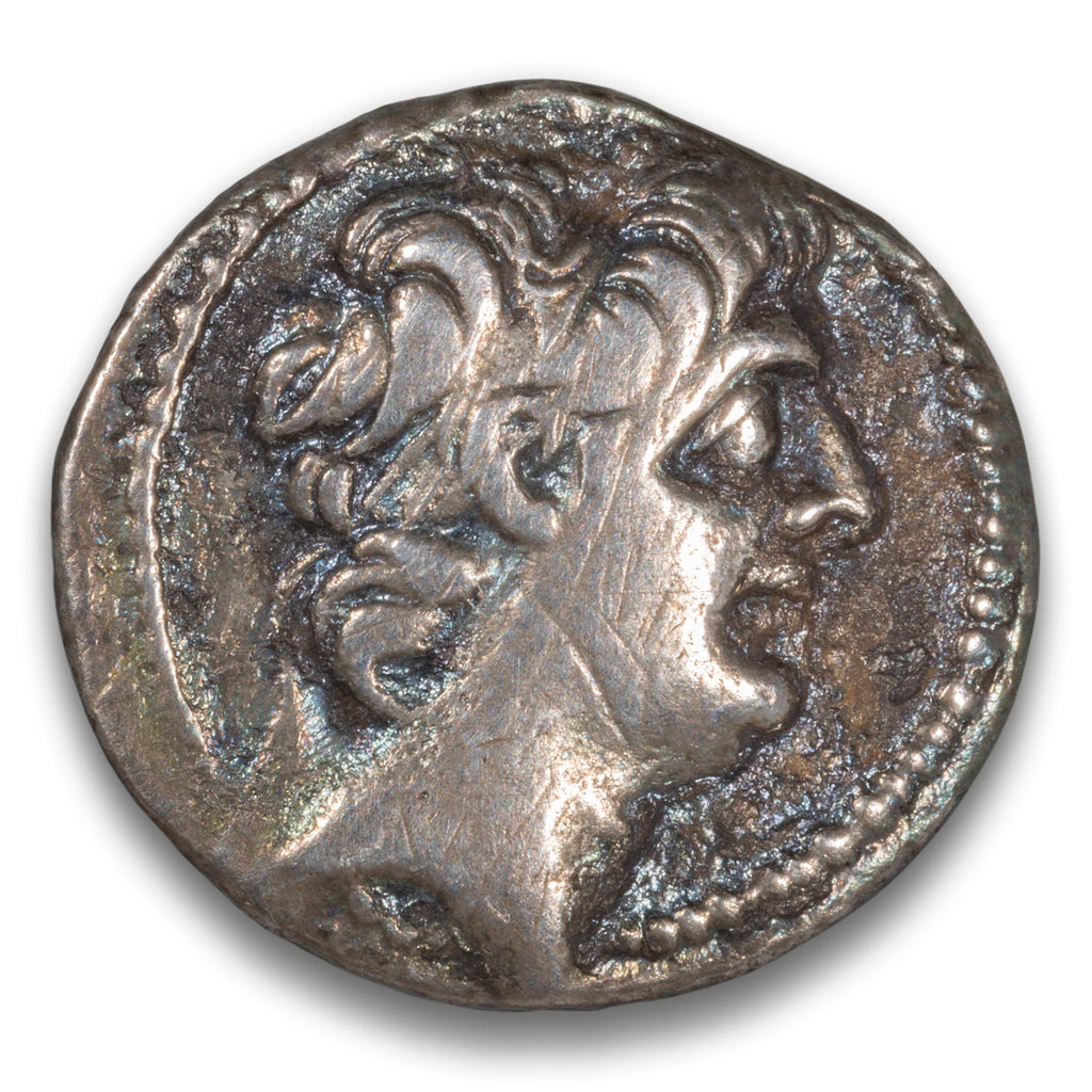 Reverse: Tyche, wearing kalathos, standing left, right hand on tiller set on ground to left