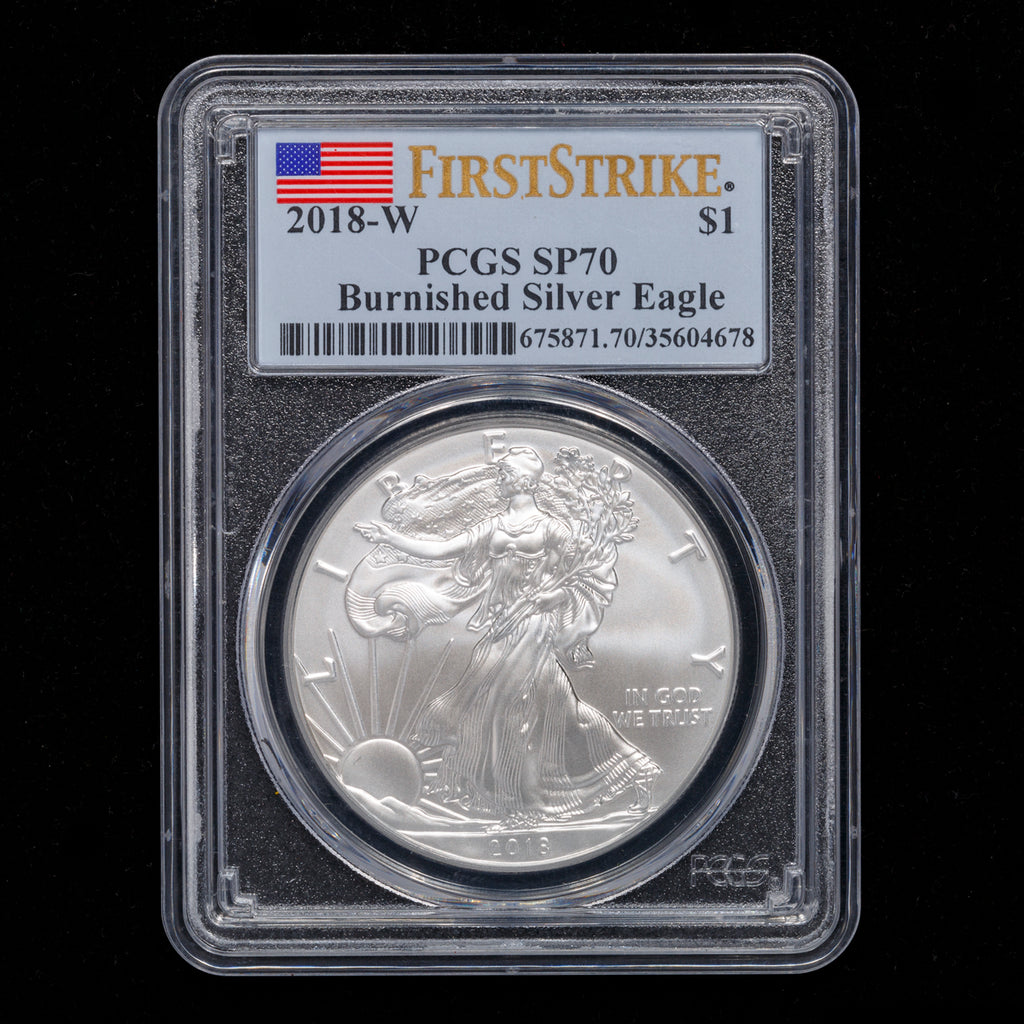 US 1oz .999 Fine Silver $1 Eagle: Burnished 2018 W SP-70