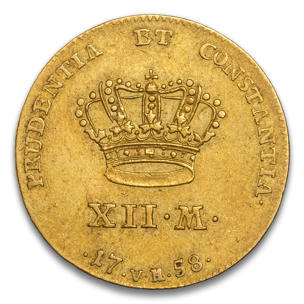 Denmark and Norway Frederik V Gold 12 Mark 1758 Copenhagen Mint