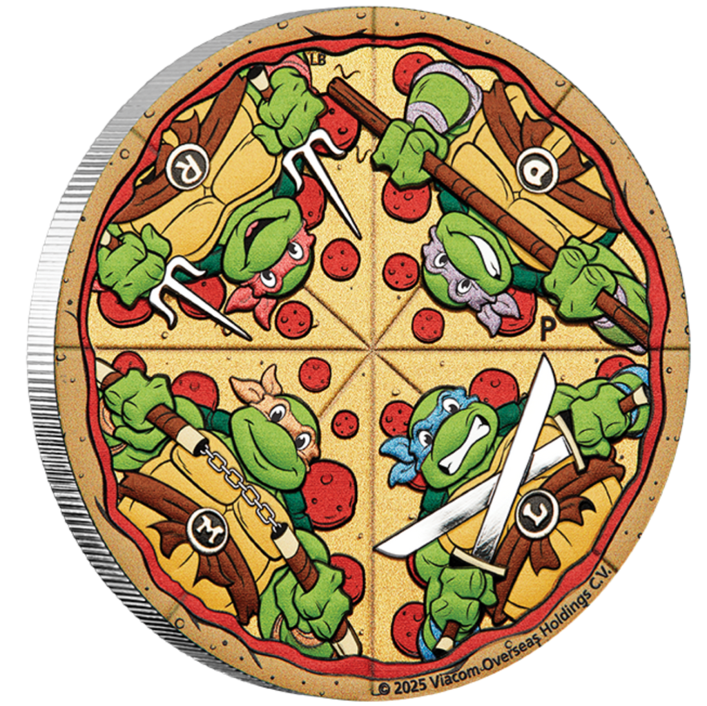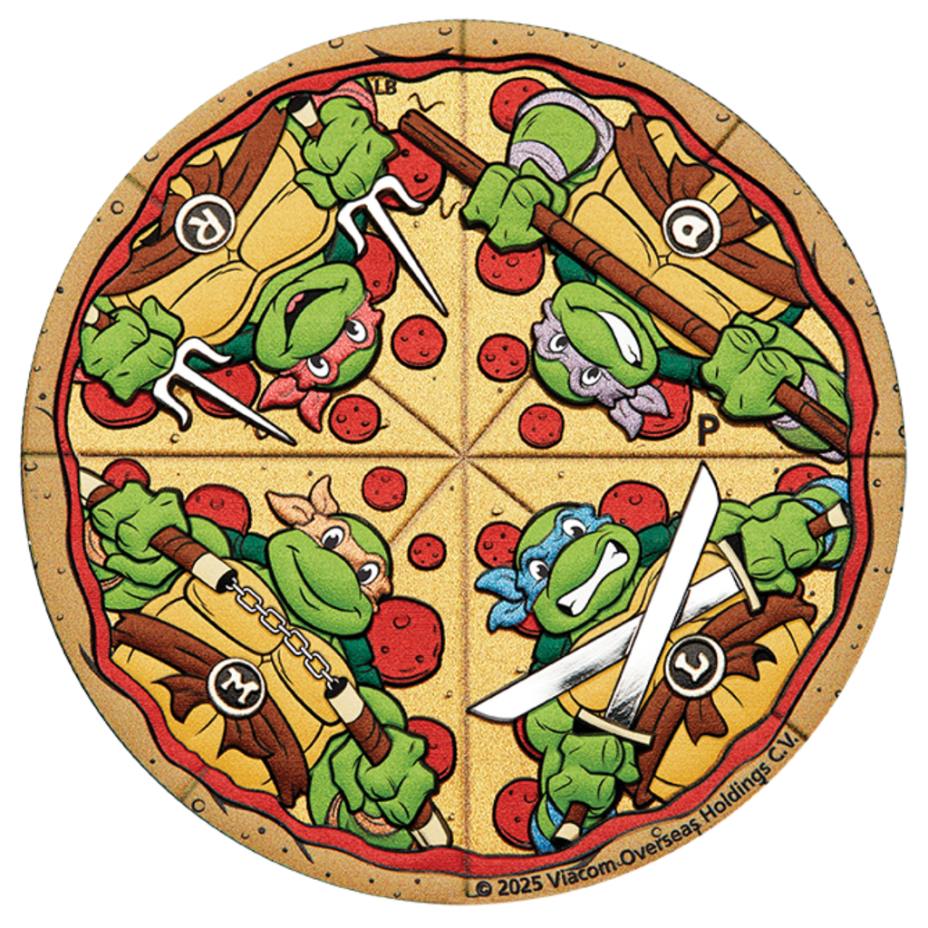 Struck by The Perth Mint, this vibrant coin is set against a backdrop of cheesy pizza slices and tasty toppings, blending the Turtles’ love for food and fight with playful flair. Also featured is The Perth Mint’s signature ‘P’ mintmark, a hallmark of quality craftsmanship.