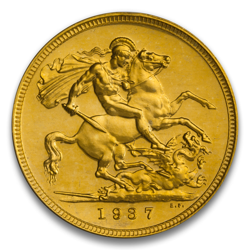 The 1937 Quintuple Sovereign or Five Pound piece: 39.94 grams and a diameter of 35.00 millimeters