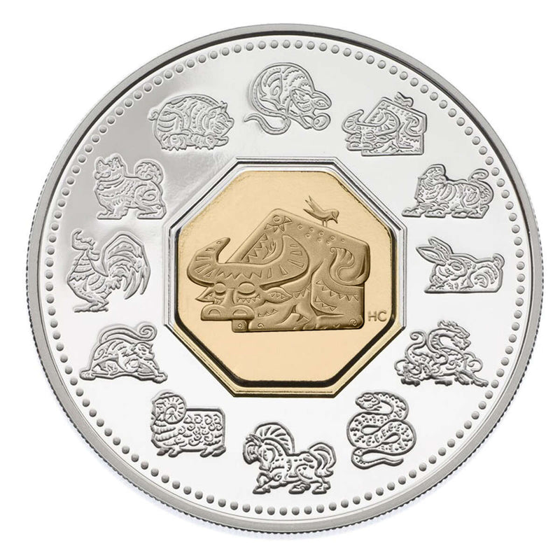 The center of the coin features an octagonal 24 karat gold plated cameo with a stylized image of an Ox, one of the symbols of Chinese astrology based on the lunar calendar. Surrounding the cameo are all 12 of the animal symbols in the lunar calendar.