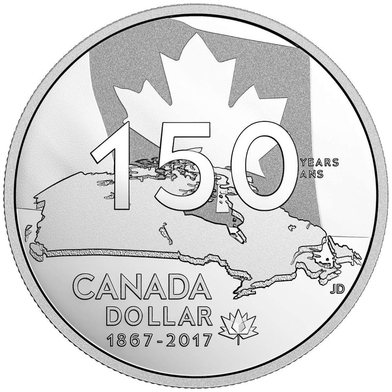 The reverse design by Canadian artist Jamie Desrochers captures the celebratory spirit of a nation in 2017. Viewed from a unique perspective, the map of Canada has a distinctive dimensional feel to it as the viewer’s eye sweeps across the nation. The focal point itself is the large “150” at the center; superimposed on the map, the “150” is as large as the nature of the celebrations commemorating the 150th anniversary of Confederation. Below it, the words “CANADA”, “DOLLAR” and commemorative dates “1867-2017” are also engraved in Heritage Canada’s official font for the occasion, alongside the CANADA 150 logo. Behind it all is Canada’s national flag, rendered in laser frosting that gives it an ethereal feel—a fitting way to convey the swelling sense of pride and patriotism that, though unseen, can be found within Canadian hearts during this momentous year.