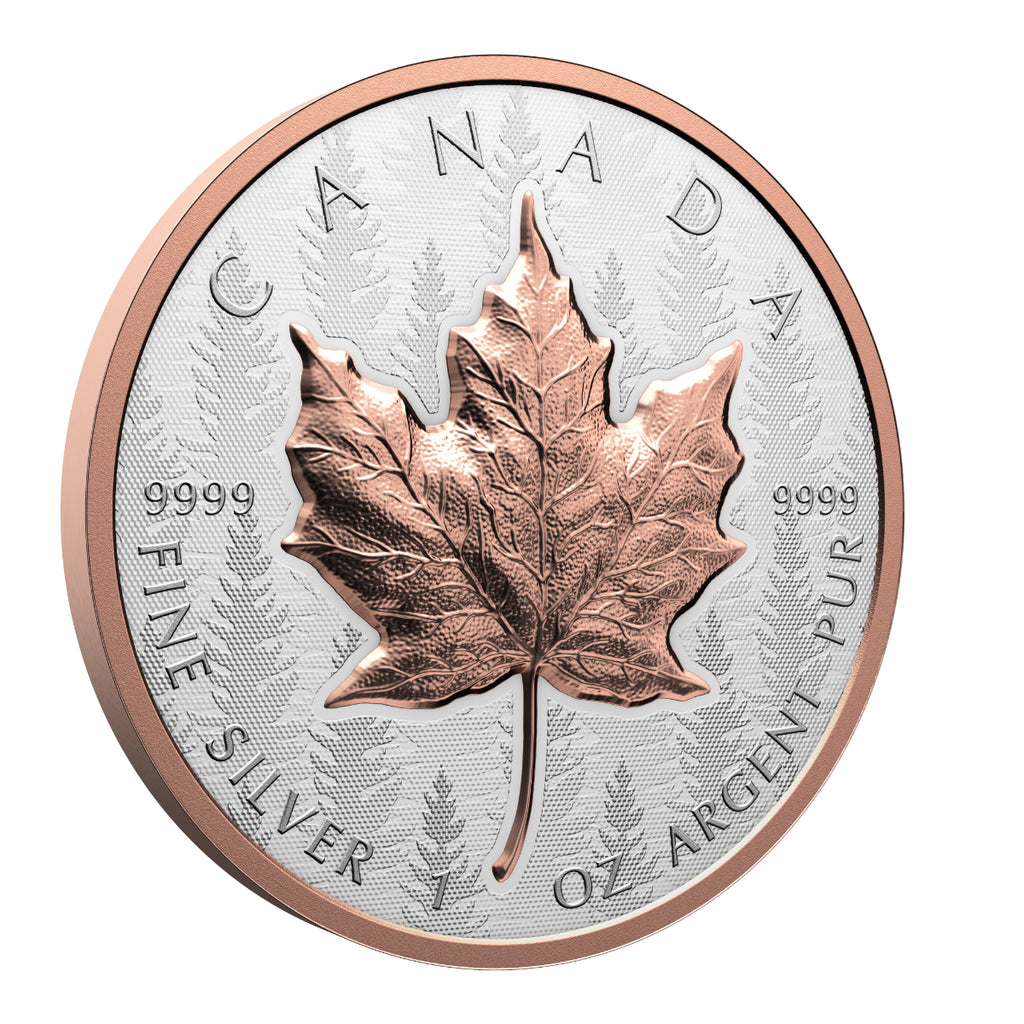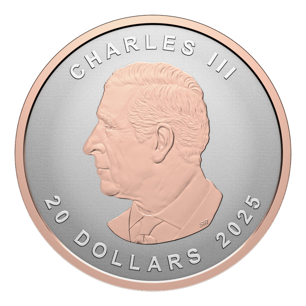 An expression of pride for these incredible landscapes, the Heart of the Forest pulsating field pattern returns in 2025, transporting the viewer into the heart of a misty forest on this 1-oz. coin’s reverse. The trees fall in and out of view behind the Silver Maple Leaf (SML) design struck in Ultra High Relief (UHR) and highlighted by rose gold plating, which stands in for red, the boldest of Canada’s fall hues and official colours.
