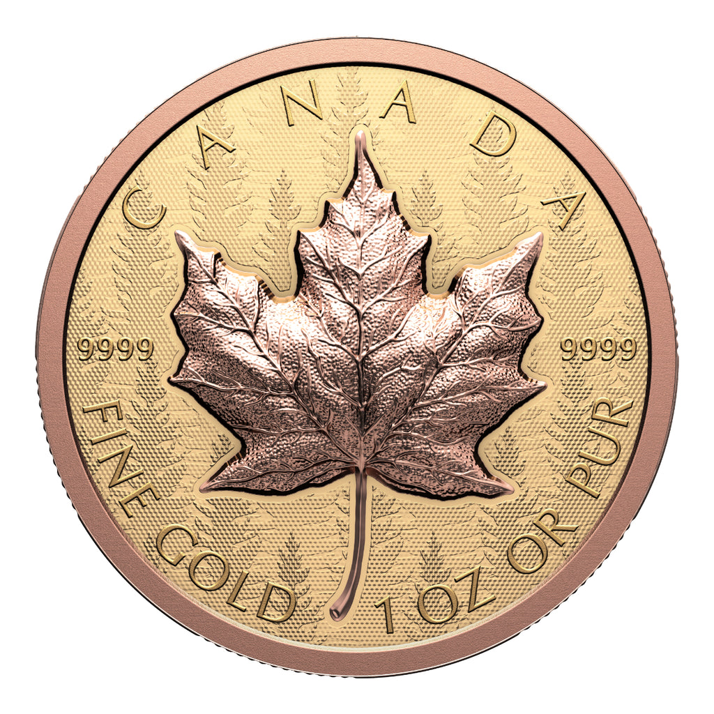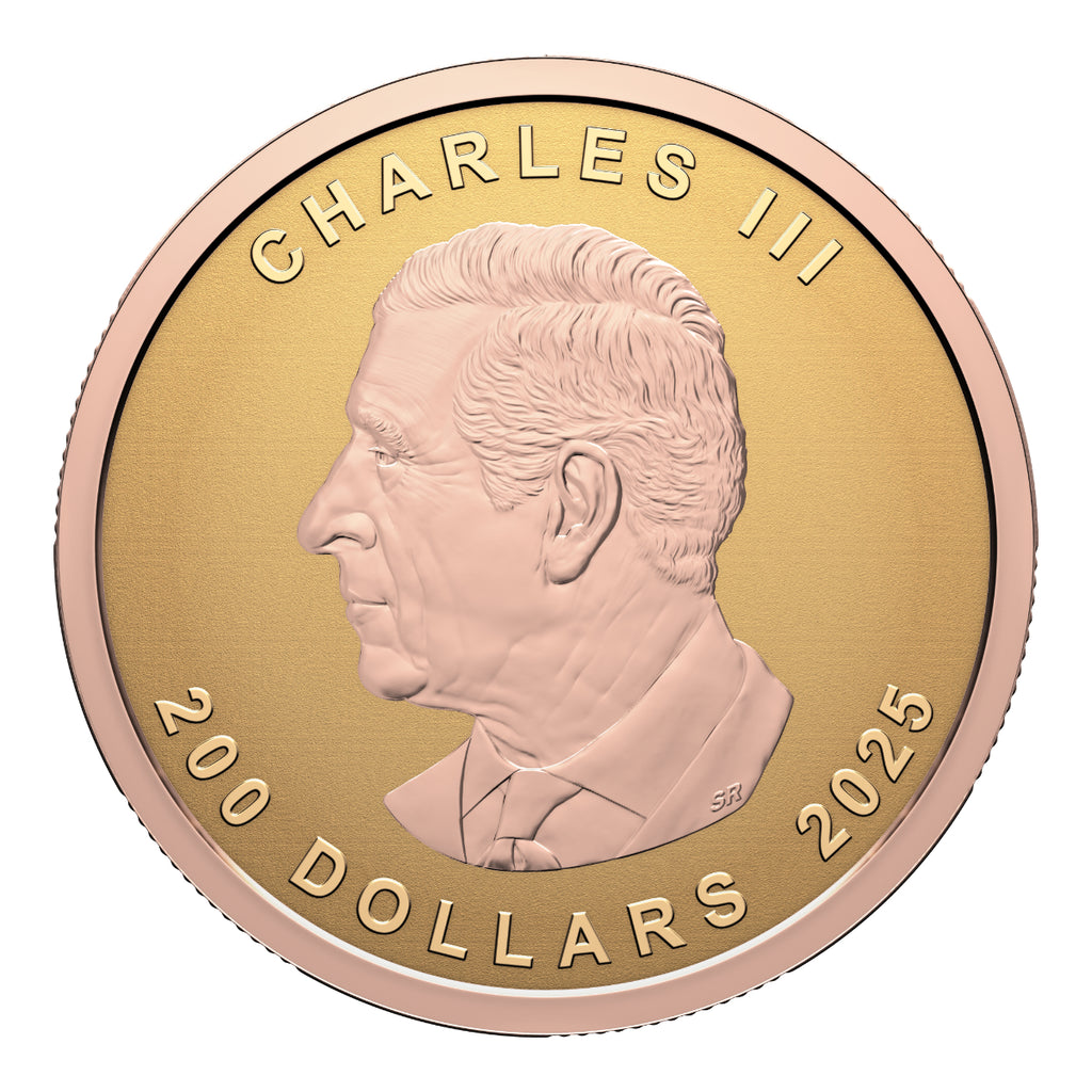 An expression of pride for these incredible landscapes, the Heart of the Forest pulsating field pattern returns in 2025, transporting the viewer into the heart of a misty forest on the reverse of this 1-oz. 99.99% pure gold coin. The trees fall in and out of view behind the Gold Maple Leaf (GML) design struck in Ultra -High Relief (UHR) and highlighted by rose gold plating, which stands in for red, the boldest of Canada’s fall hues and official colours.