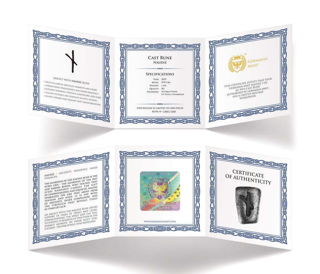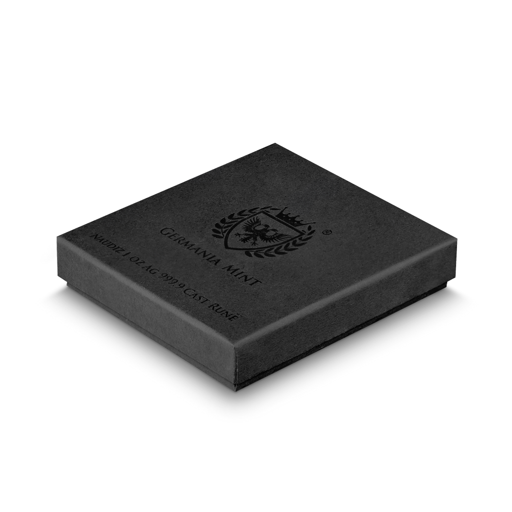 Germania Mint proudly presents the Naudiz Rune, a 1 oz collectible bar crafted from .9999 fine silver and marked with a unique number and mint mark. Part of the exclusive Runes series, each piece is ennobled with a hidden magical colour that reveals itself only under UV light, adding a mystical dimension to this striking collectible. Complete with a Certificate of Authenticity and minimalist packaging, it is both a meaningful keepsake and a refined gift.