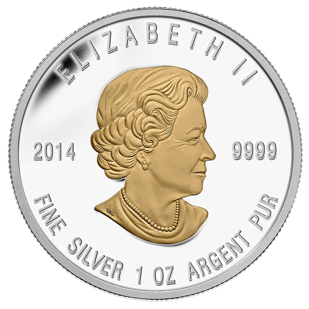 This coin depicts an image of a great bear standing behind an abstract warrior figure. The bear's head is lowered because there is no need for an outward display of strength; everyone knows the bear's power. The bear is the warrior's mentor and guide; a source of wisdom and courage to fight when necessary. The background pattern of sweetgrass reinforces the bear's teachings. Sweetgrass is considered the hair of Mother Earth and is therefore braided. On the back of the coin the effigy is gold plated. The words “Elizabeth II” and “Fine Silver 1 oz Argent Pur” are around the rim of the coin. On the left is the date “2014”, and on the right is “9999”.