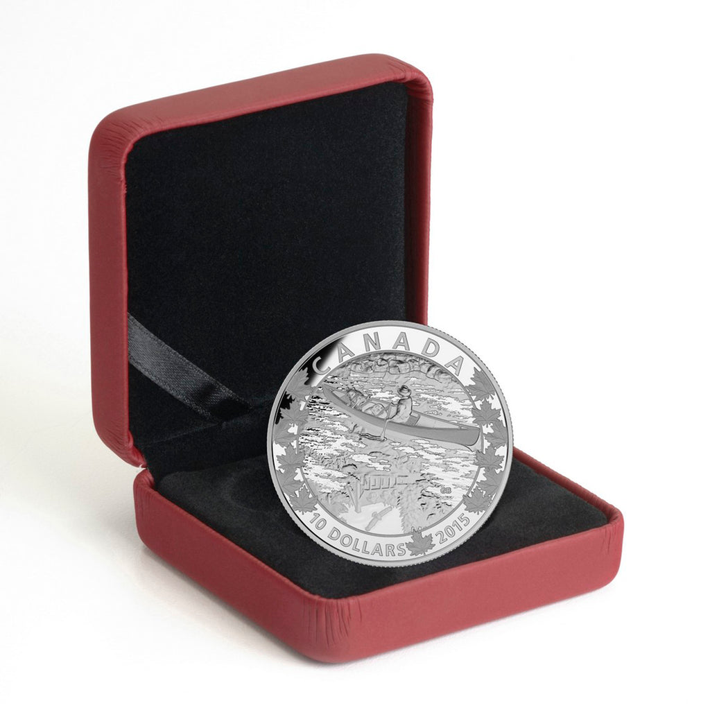The reverse design by Canadian artist Greg Banning features an outdoorsman and his dog floating in their canoe on a still, reflective lake in Quebec’s Laurentian Mountains. The canoe crosses the image near the top, pointing toward the left side of the coin. The outdoorsman’s head is turned toward a nearby rocky shore in the background, while the husky’s attention is fixed on the reflection, in the still lake, of a bald eagle soaring in the sky above. The images reflected in the lake reveal more about the scene. The design also showcases a mixed evergreen and deciduous forest, characteristic of this part of Canada, rising above the water. On the shore, a three-gabled habitant-style house overlooks the water. The image is framed by an outer band engraved with maple leaves.