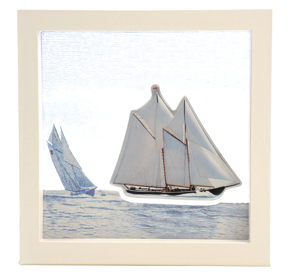 Canada faced a great challenge with this new race, as the American fishing vessels were usually smaller and faster. In 1920, the inaugural race was won by a ship from Gloucester, Massachusetts, and the Canadians vowed to defeat their rivals the following year. It was this challenge that inspired Halifax businessmen and Captain Angus Walters to commission W.J. Roué to design a sleek new ship that could beat the New England rivals. The new Bluenose schooner was completed in early 1921, and was designed both as a working fishing vessel and a racing craft. With Angus Walters at the helm, the Bluenose triumphed in its first race, and the ship remained undefeated through an 18 year career. For this work of medallic art in pure silver, the original design has been brought to life with realistic colour by renowned Canadian artist Trevor Tennant.