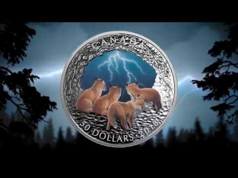 The reactions of four colourful fox cubs mirror our own mixed sense of awe and apprehension: three curious cubs have their backs turned to the viewer as they watch a forked lightning bolt light up the deep hued sky, while a fourth seemingly shrinks away from the scene. The integrated use of glow-in-the-dark technology also allows for an alternate view of this stormy night — this time viewed in the dark, where photoluminescence stands in for the lightning’s electrified glow. The reverse also includes the engraved word “CANADA”, the face value “50 DOLLARS” and the year, “2018”. The obverse features the effigy of Her Majesty Queen Elizabeth II by Susanna Blunt.