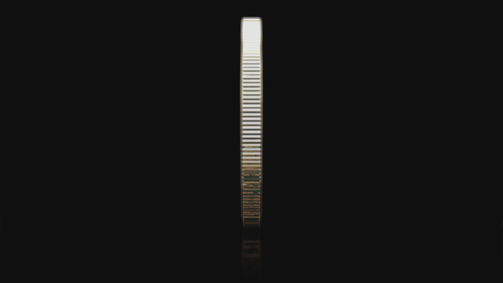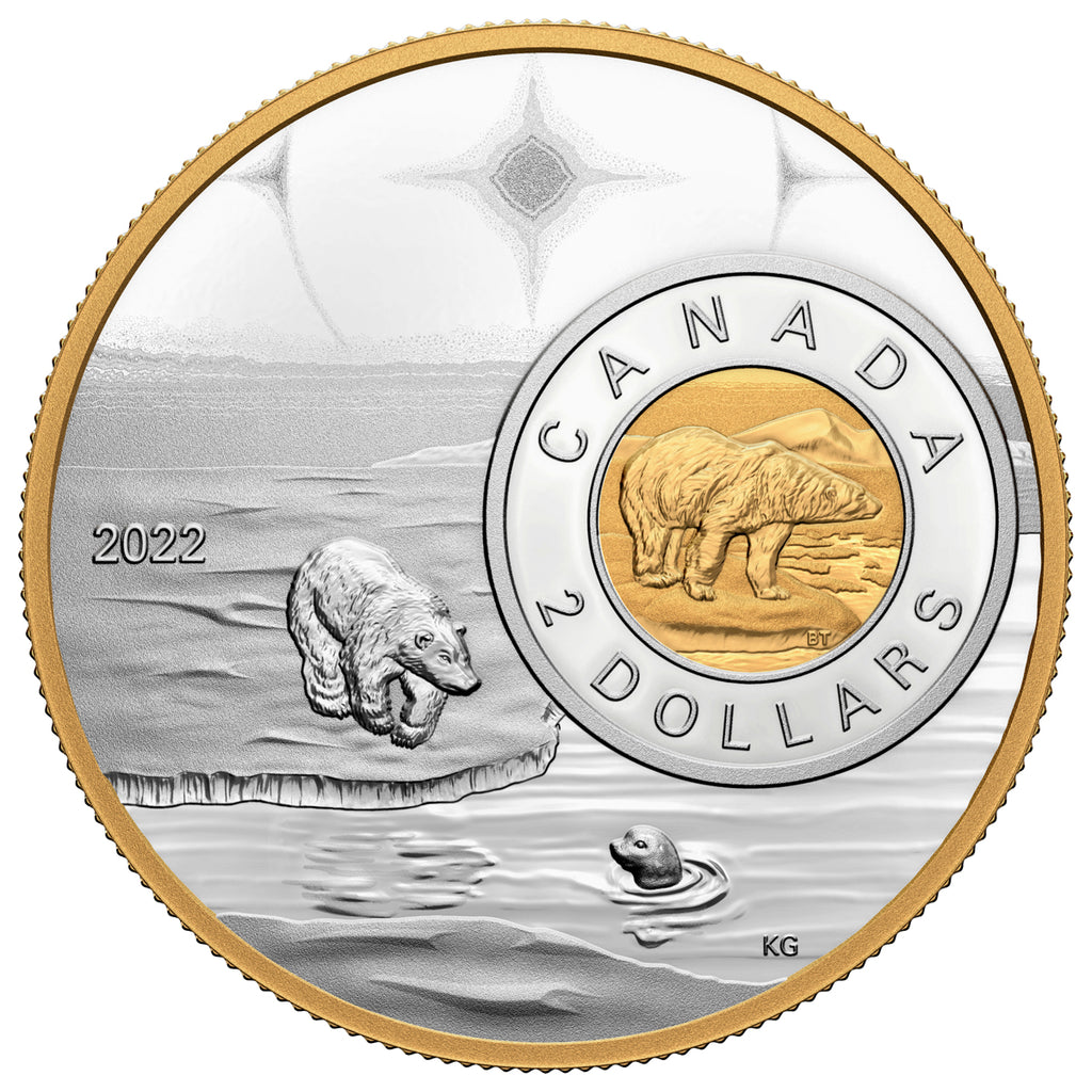 The $2 coin design re-imagines Canada’s two dollar circulation coin, shifting the focus to the polar bear. The classic twoonie makes up part of the design with a selective gold-plated finish, while the balance of the engraved art showcases a polar bear standing on an ice floe looking out at a seal that has just surfaced.