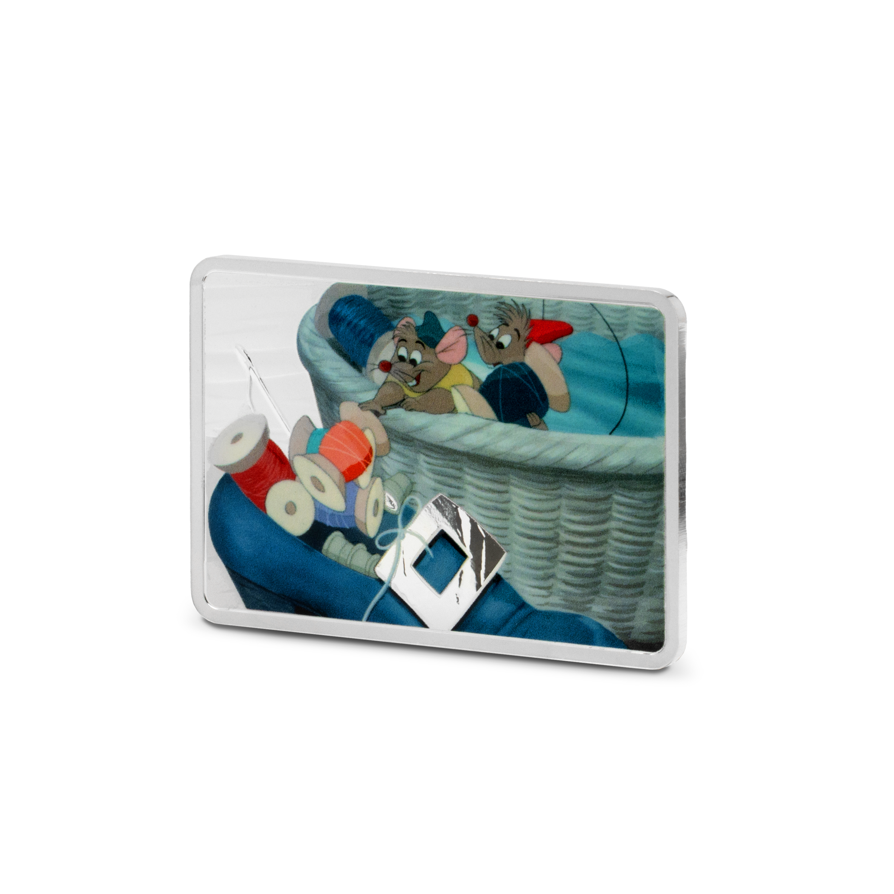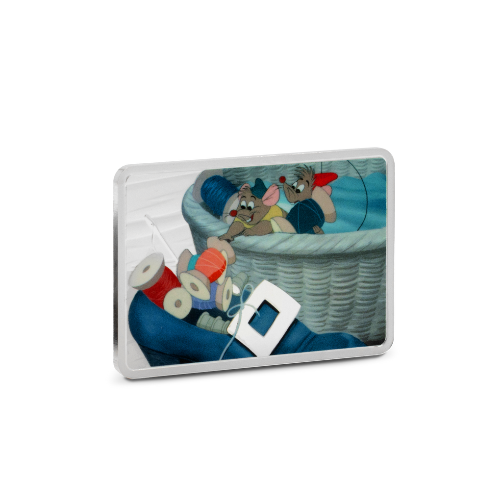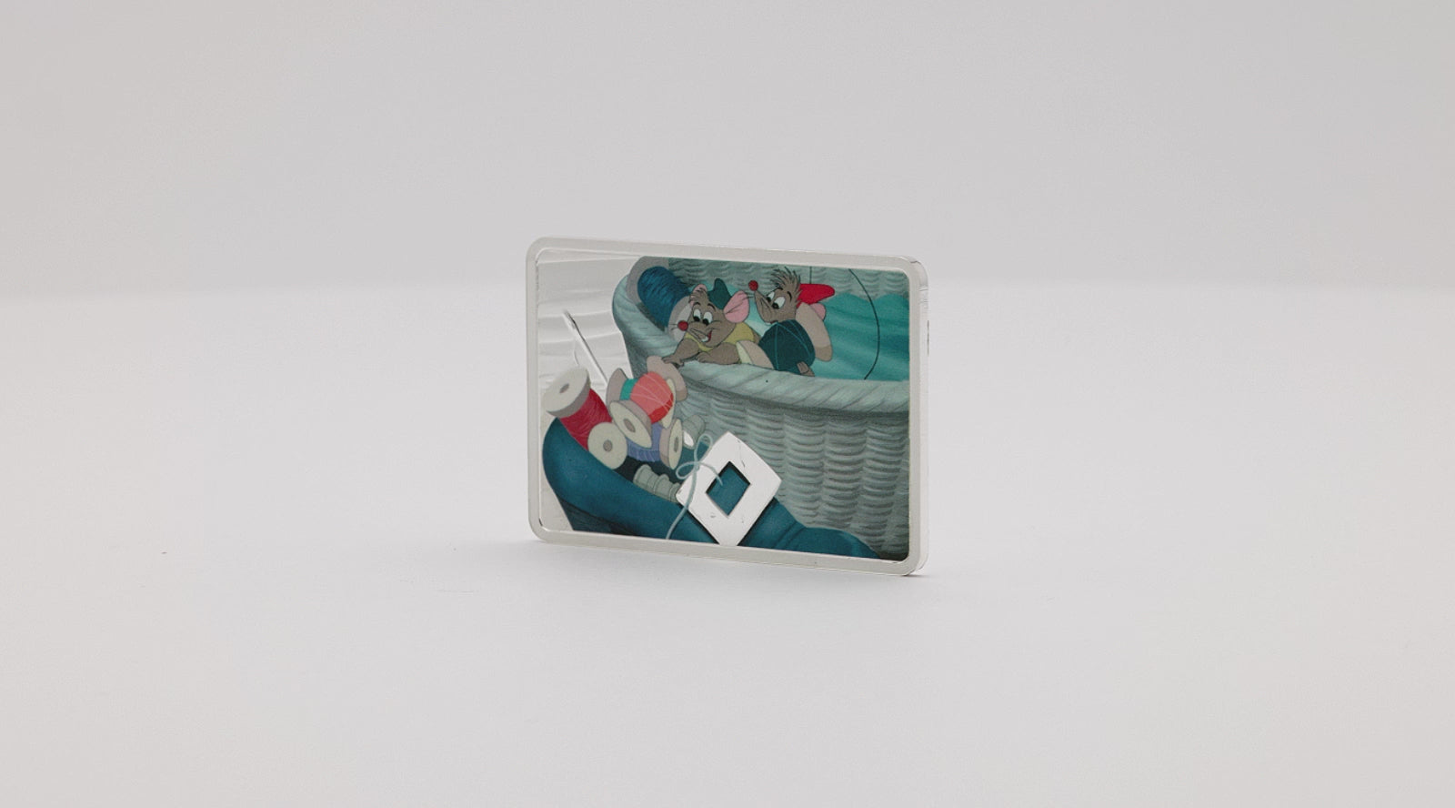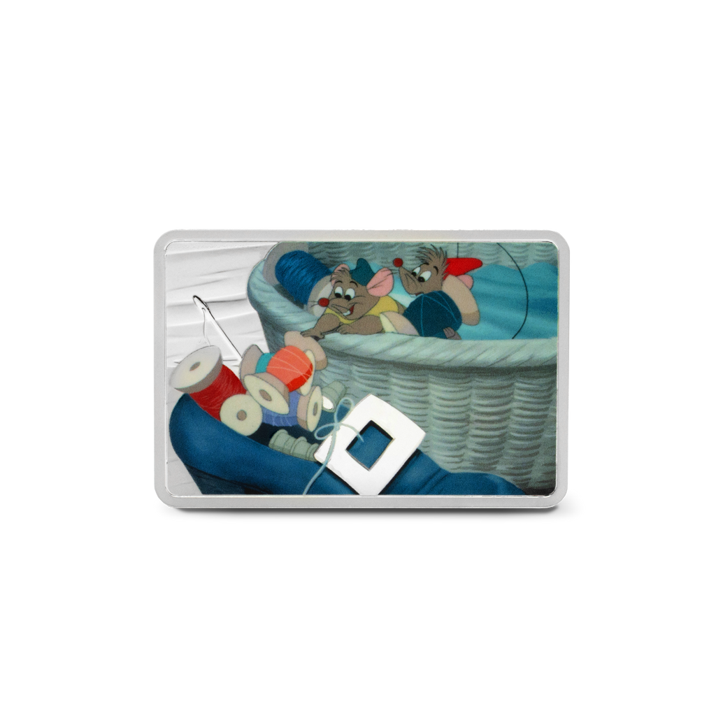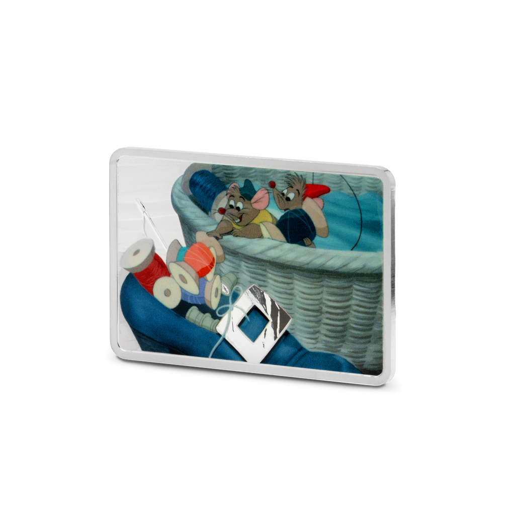 This officially licensed silver coin brings their heartwarming moment to life with stunning coloured artwork depicting Jaq and Gus as they carefully place spools of thread in a shoe. The background and shoe buckle are elegantly engraved with a frosted finish, while the needle gleams in a striking mirror effect. With an exclusive mintage of just 2,000 coins worldwide, each piece is individually numbered on the obverse and confirmed as legal tender by the Public Seal of Niue.