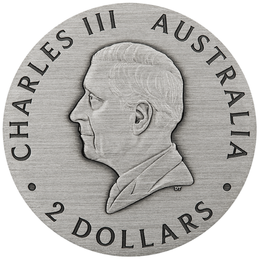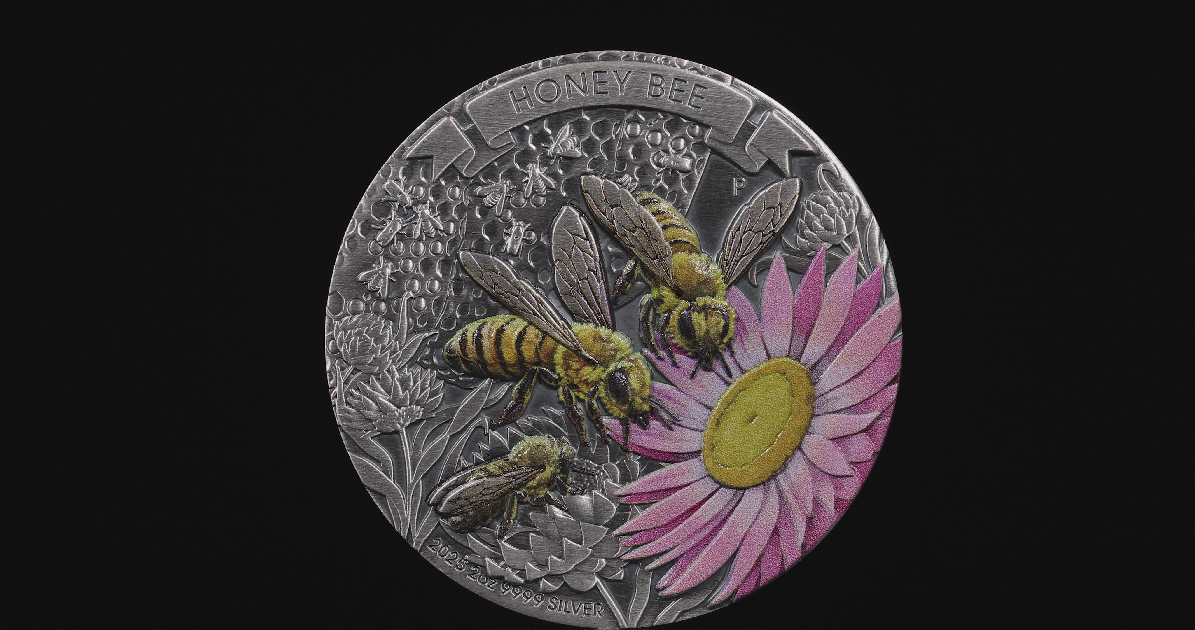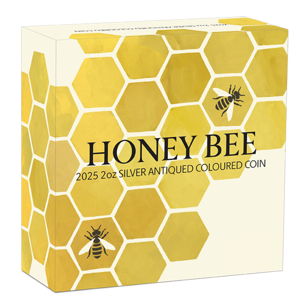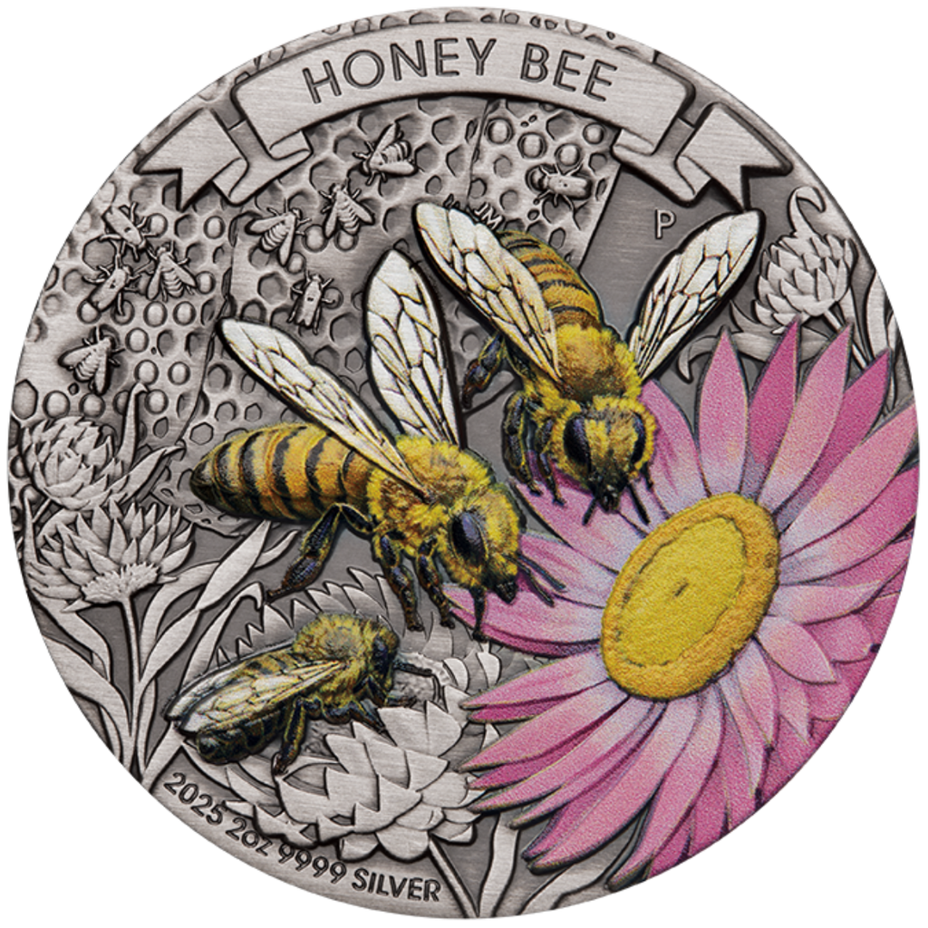 Struck from 1oz of 99.9% pure silver, the coin features two coloured worker bees delicately perched on the vibrant petals of a pink daisy with a sunny yellow center. The background showcases an intricate design of honey bees at work, surrounded by golden honeycomb and blooming flowers. A ribbon scroll inscribed with “HONEY BEE,” the coin’s weight, purity, 2025 year-date, and The Perth Mint’s ‘P’ mintmark complete the design.
