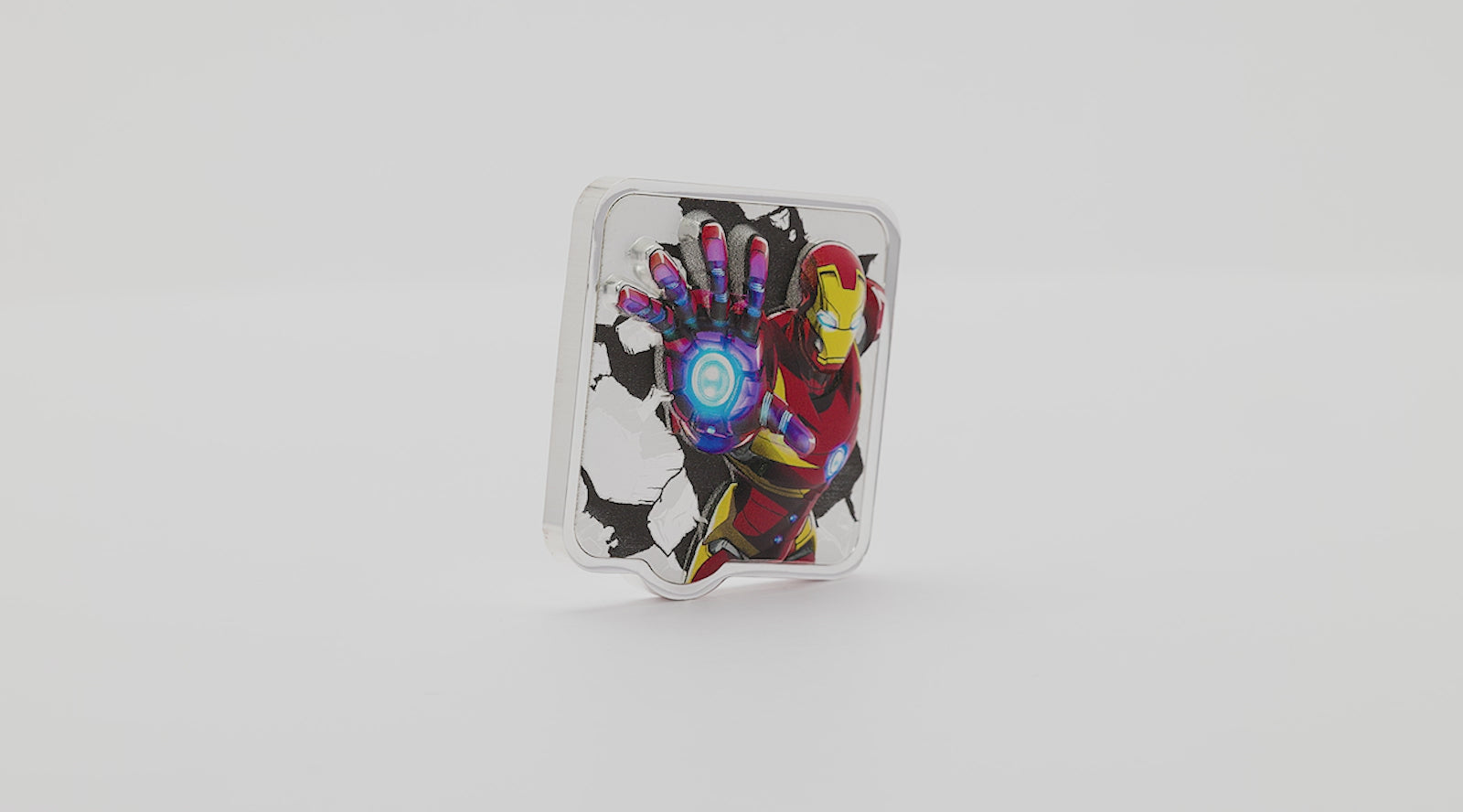 Feel the power of Iron Man with this 2oz 999 pure silver collectible, the sixth release in our Mighty Marvel Super Heroes series. Iron Man bursts through rubble, his helmet and torso in high relief, with his outstretched hand in ultra-high relief as he unleashes a repulsor blast in full-colour red-and-gold armour.